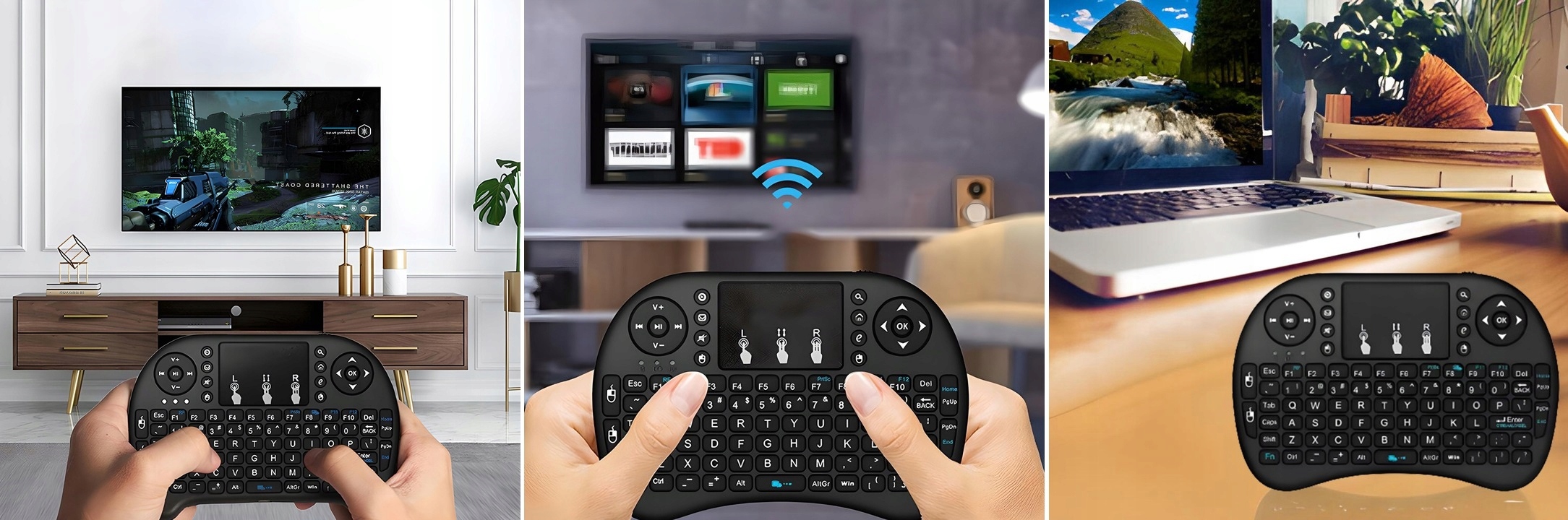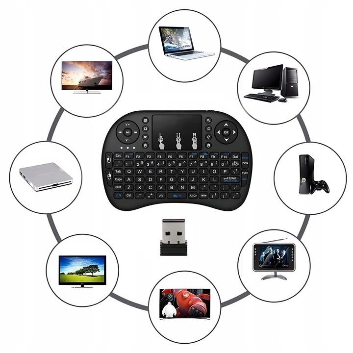 Міні-бездротова клавіатура 2,4 ГГц надзвичайно корисна в багатьох ситуаціях. Це дозволить зручно управляти багатьма пристроями на значній відстані - до 15 метрів. Ідеально підходить для використання в мультимедійних академічних лекціях, презентаціях, а також для повсякденних розваг – смарт-телевізор (із системою Android), ігрові приставки, домашні кінотеатри, комп’ютери тощо.