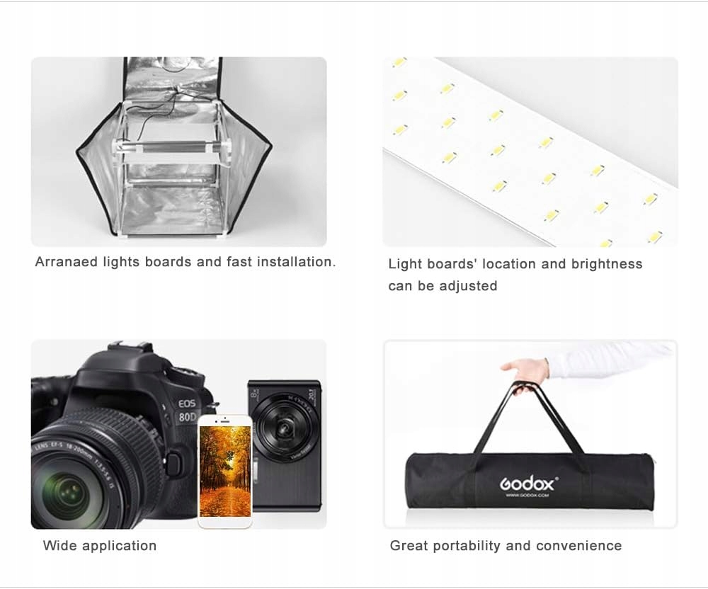 Потрійне світлодіодне освітлення Mini Studio Фотором, розмірами після розгортання: 60 х 60 х 60 см. Завдяки закладеним світлом та яскравості світла, вони заощаджують час та заощадження.