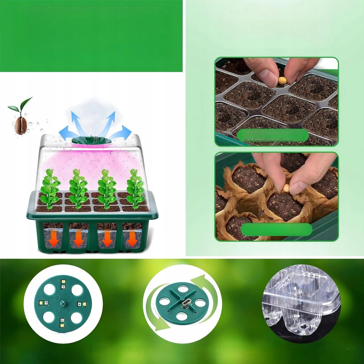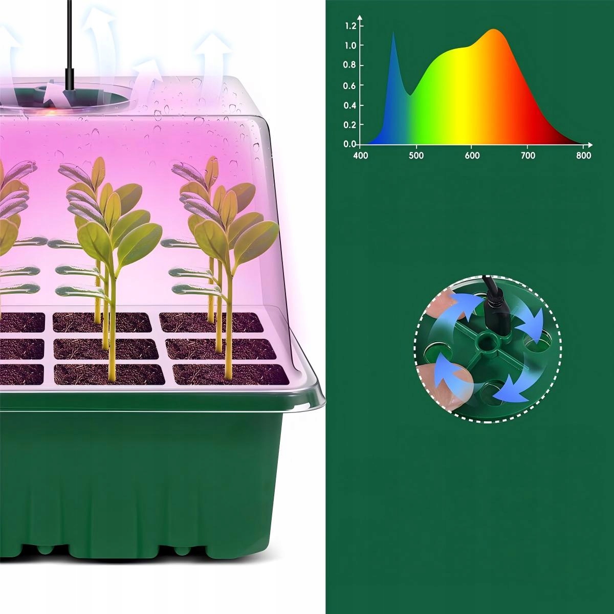 Наші піддони для розсади виготовлені з матеріалу ПВХ товщиною 0,8 мм, який можна багаторазово використовувати, він міцний і не б’ється. 2 регульованих круглих отвори сприяють циркуляції повітря та росту насіння, а піднята кришка забезпечує достатньо місця для росту насіння. (Примітка: уникайте тривалого впливу високих температур понад 48°C).