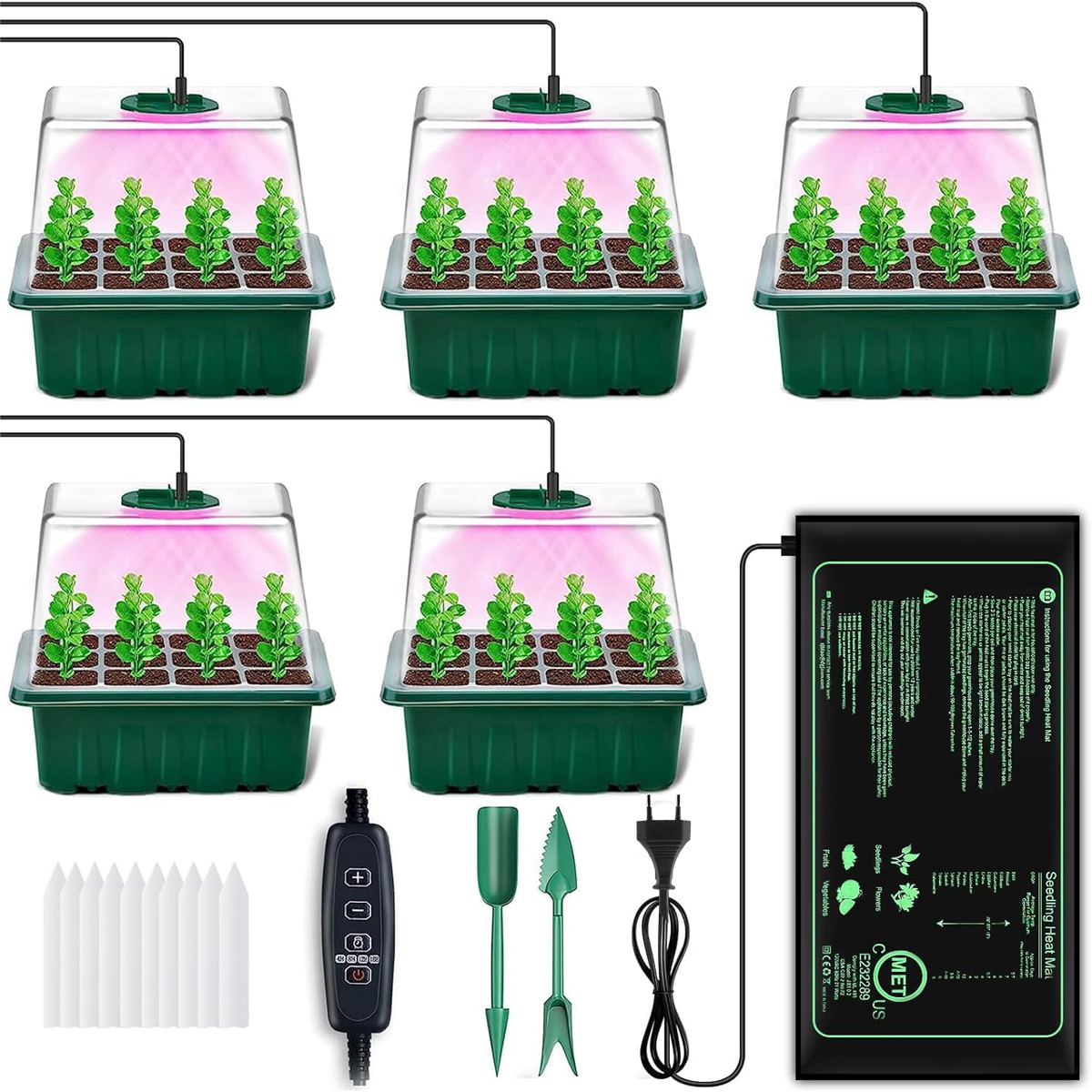 🔥🔆🔥Контейнер для насіння з лампою для вирощування, набір із 5 стартових наборів насіння з нагрівальним килимком, контейнери для розсади з таймером, регульована яскравість, товсті стінки та кришки із зволожуючими куполами🔥🔆🔥