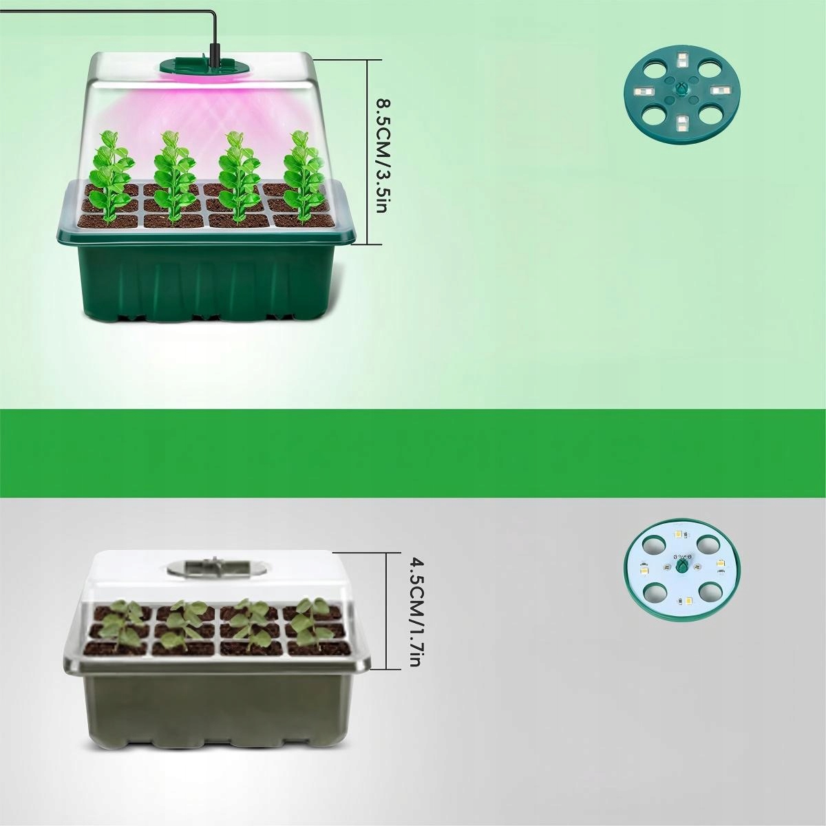 Кожний лоток для розсади має 1 лампу для вирощування з 8 світлодіодами. Світло повного спектру, подібне до природного сонячного світла. Сприяє росту в приміщенні шляхом прискорення фотосинтезу, ідеально підходить для всіх стадій росту та різноманітних рослин.