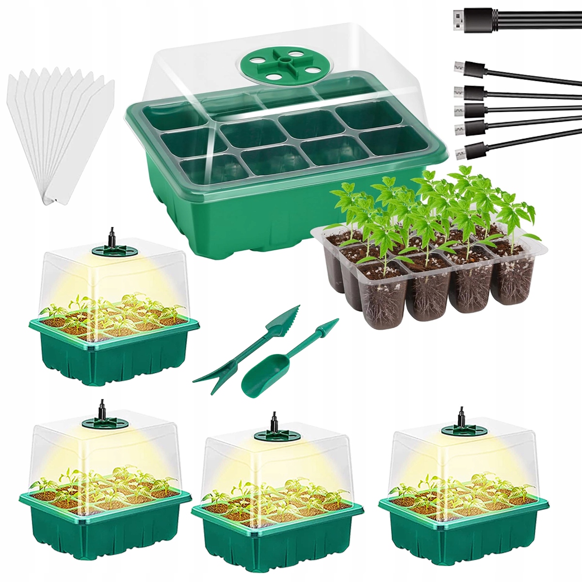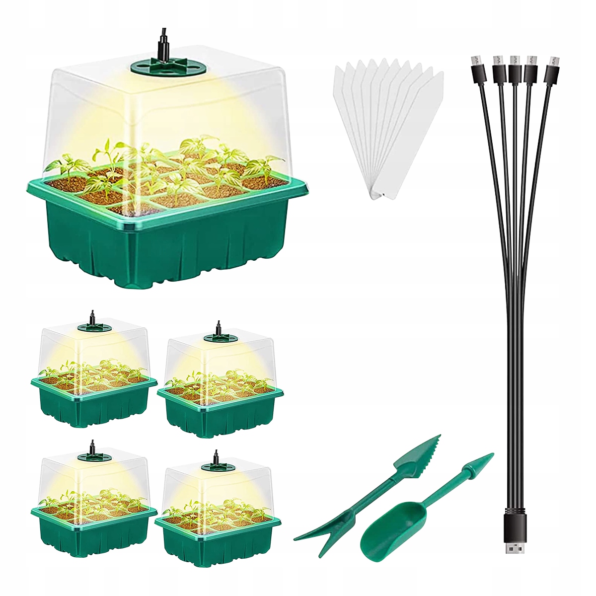 - 5* наборів ящиків для пророщування насіння (включно з 12 вставками для комірок, прозорою кришкою, нижнім лотком),