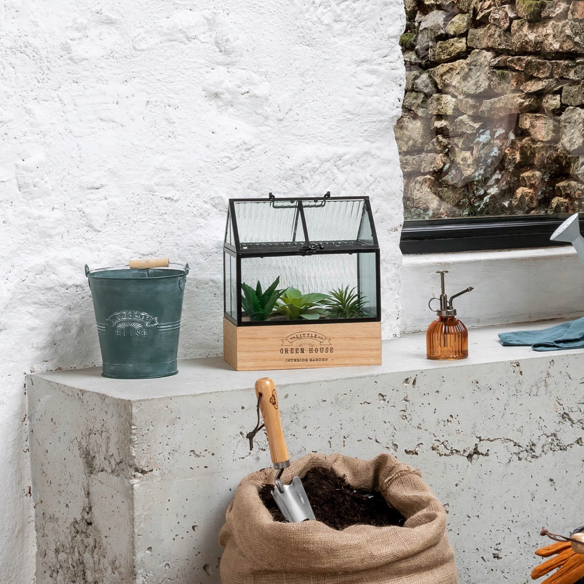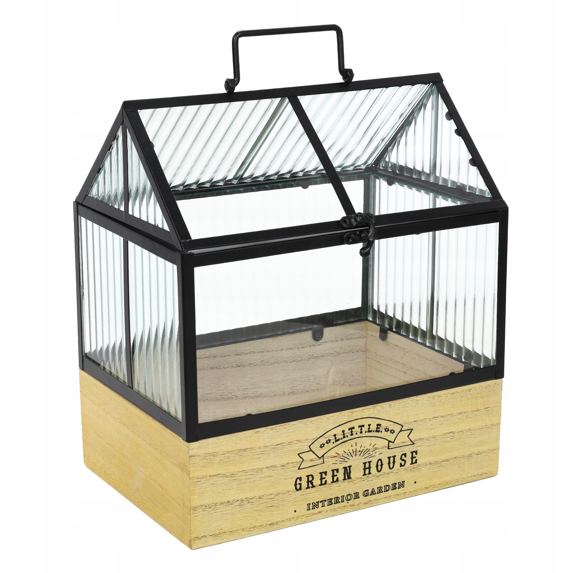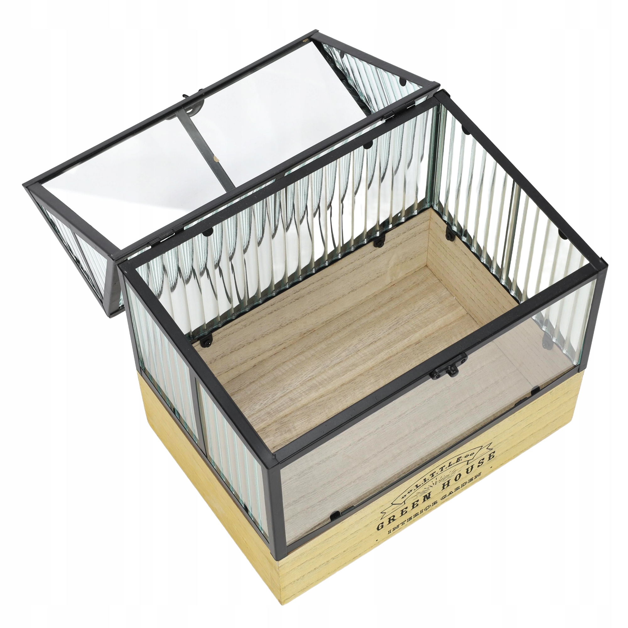 Теплиця має двосхилий дах, який можна відкрити для доступу до рослин. Це полегшує зручна ручка, розташована посередині. Додатковою перевагою є стильна засувка у вигляді гачка, за допомогою якої можна захистити теплицю від випадкового відкриття. Глибока поснова з натурального дерева прикрашена одним чорним логотипом зі стилізованими написами, що додатково підкреслює його візуальну цінність.