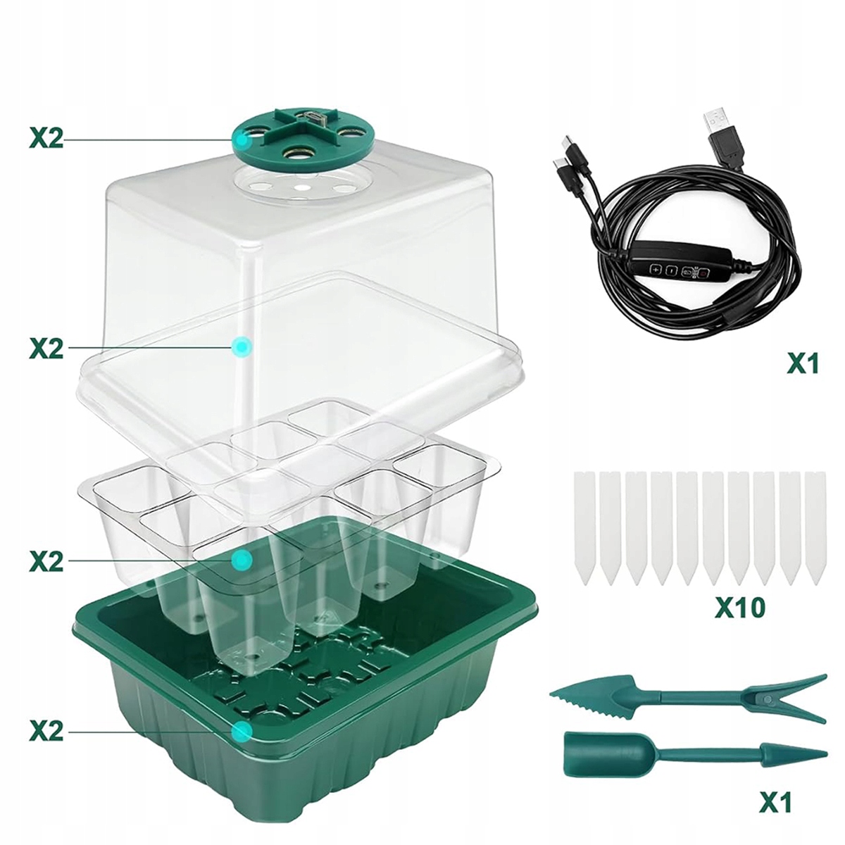 ☘️【Набір для розсади】2 упаковки контейнерів для вирощування розсади (включаючи лоток з 12 відділеннями, прозору кришку, світлодіодний вимикач та підставний лоток). У набір також входять вішалки для рослин і інструменти для розсади. Ідеально підходить для вирощування в закритому грунті та централізованого управління рослинами. Тепличні аксесуари підходять не тільки для пророщування насіння і гідропоніки, але і для пророщування розсади.