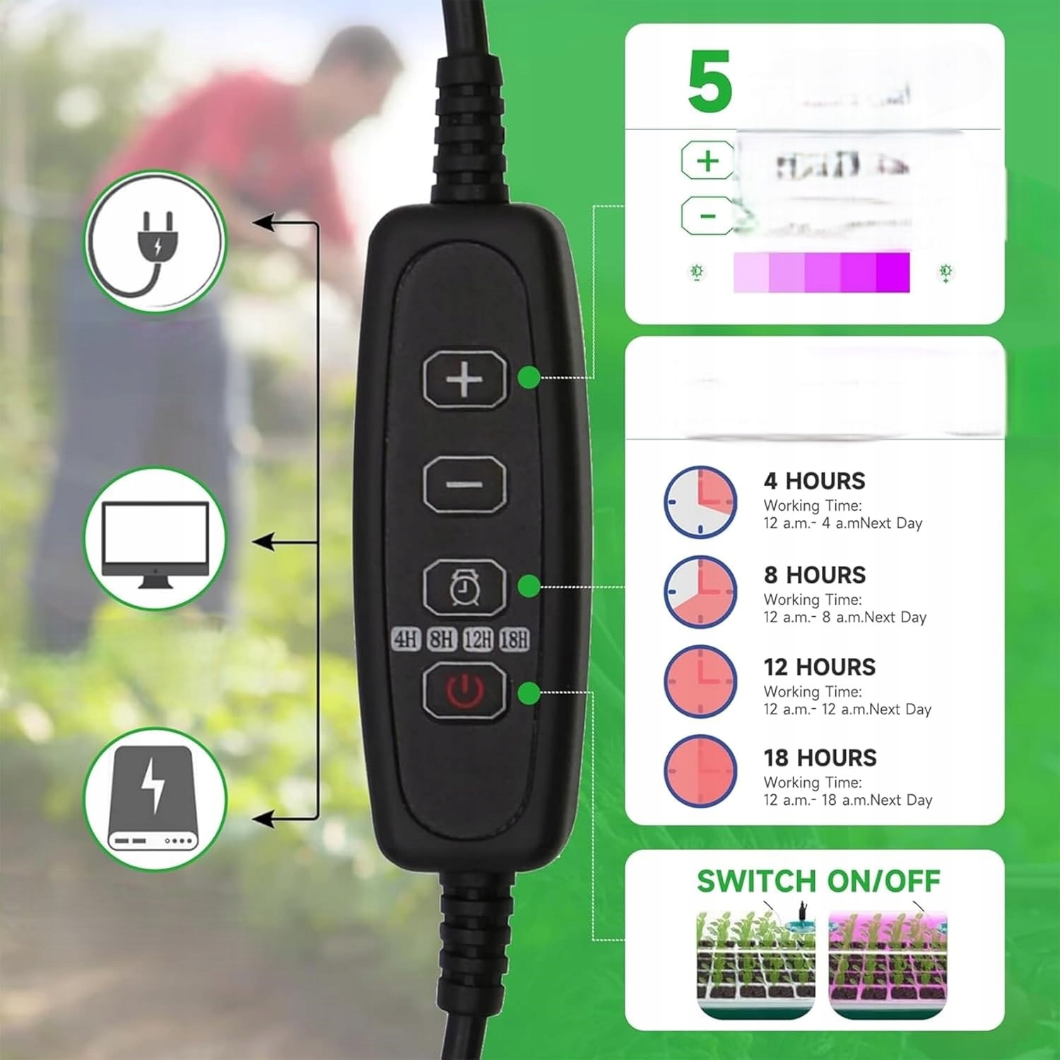 - Регульована яскравість і таймер - 4 рівні яскравості та автоматичне відключення через 4/8/12/18 годин.