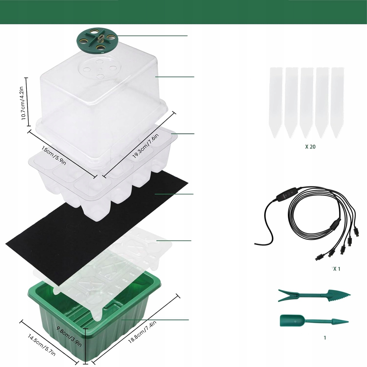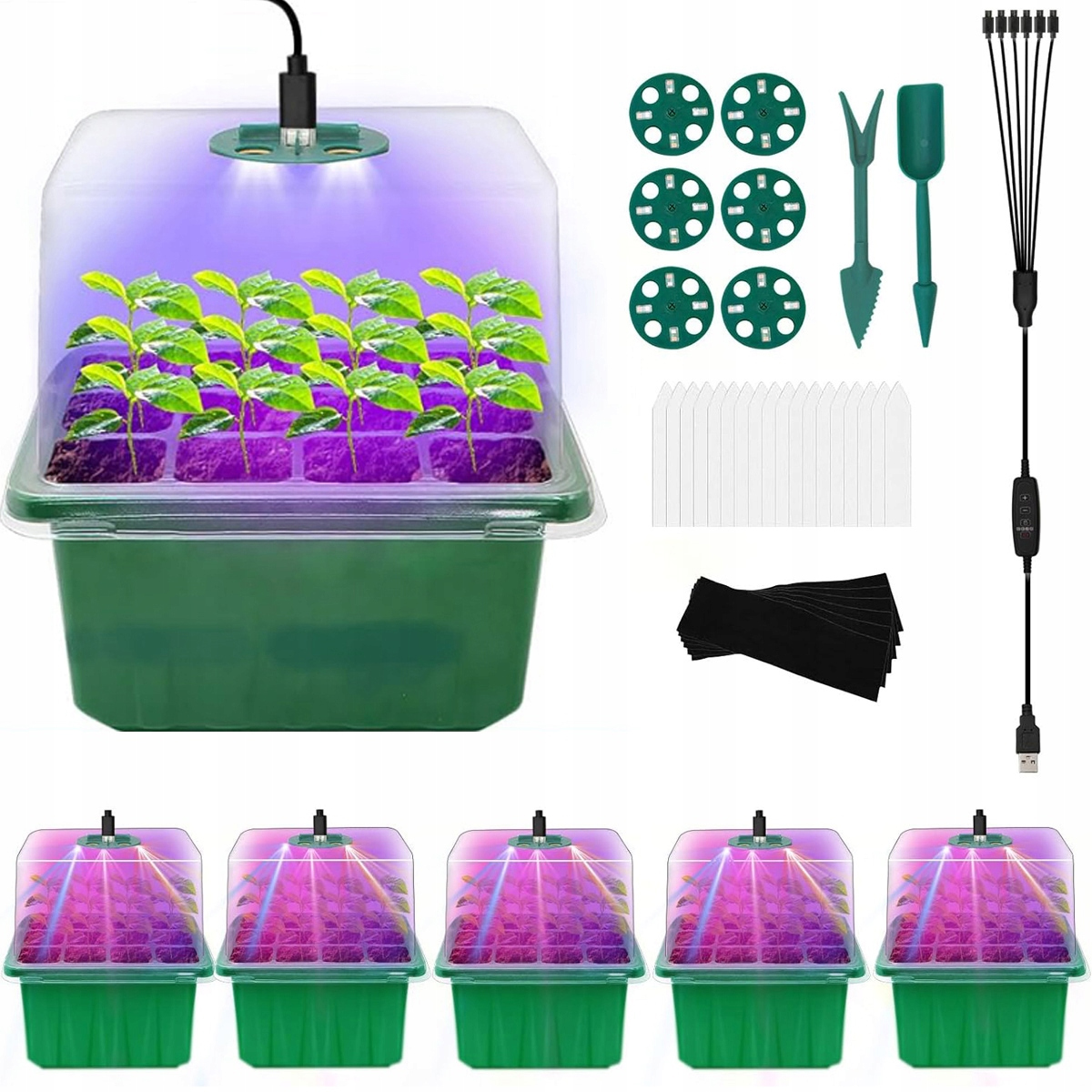 Комплексний пристрій для розмноження рослин включає: - 6 лотків для насіння (12 комірок на лоток), 6 куполів для зволоження, 6 водонепроникних підставок, 6 опорних лотків, 6 капілярних килимків, 6 ламп для росту рослин (роз’єм типу C), 1 систему Smart Control (2 м USB-C). Кабель, від 1 до 6), 20 пластикових ярликів для рослин, 2 інструменти для рослин. Ідеально підходить для посіву насіння, пророщування насіння, розмноження розсади, посадки сукулентів або будь-якого іншого типу розмноження клонів рослин.