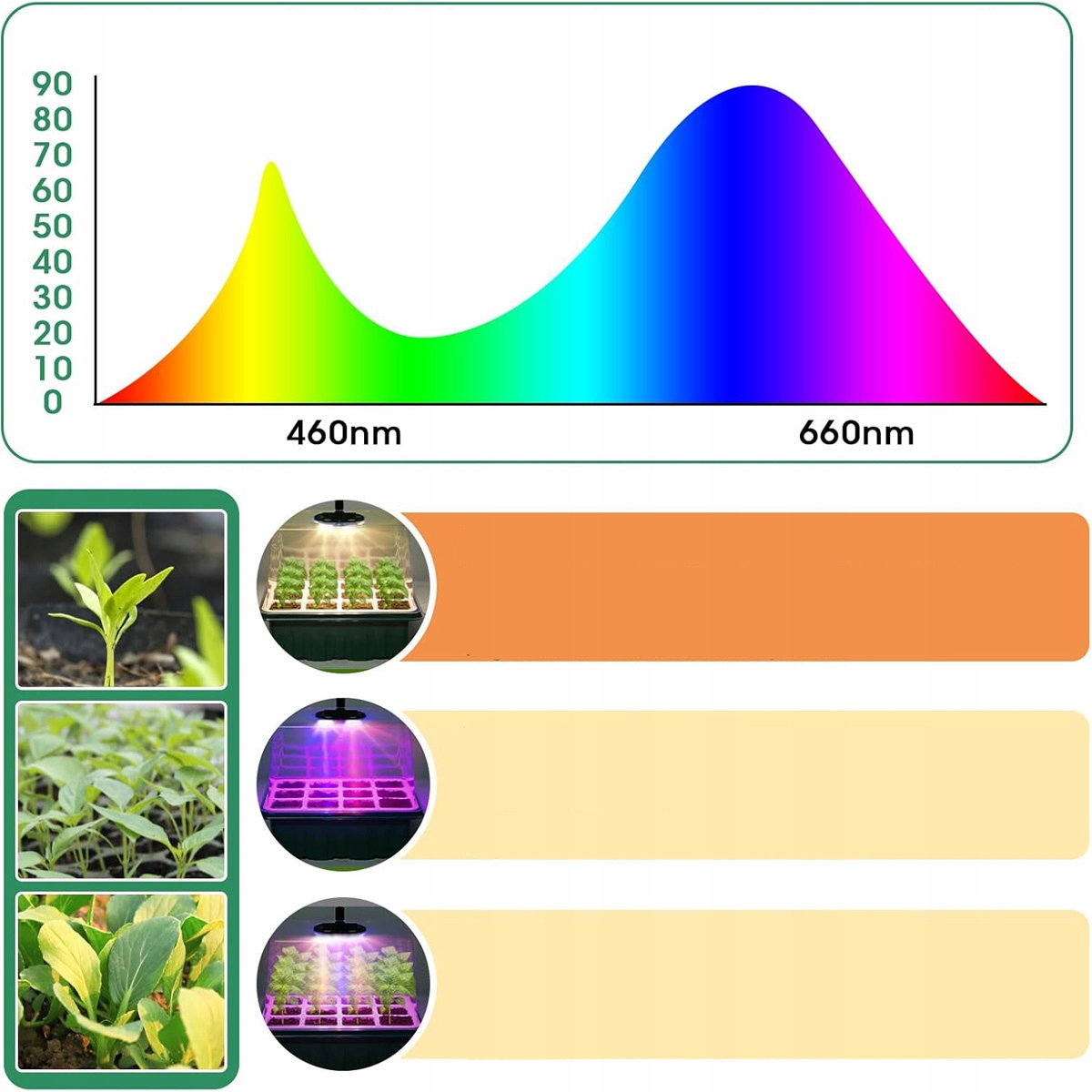 Цей піддон для розсади не лише має три режими освітлення (червоний + синій + теплий білий, червоний + синій, теплий білий) і п’ять рівнів яскравості (20%/40%/60%/80%/100%), але також розроблений для різних рослин на всіх стадіях росту. Він також має функцію чотириступеневого таймера (4 год/8 год/12 год/18 год), який забезпечує повний спектр світла, наприклад природного освітлення, яке значно підтримує ріст кімнатних рослин шляхом прискорення фотосинтезу.