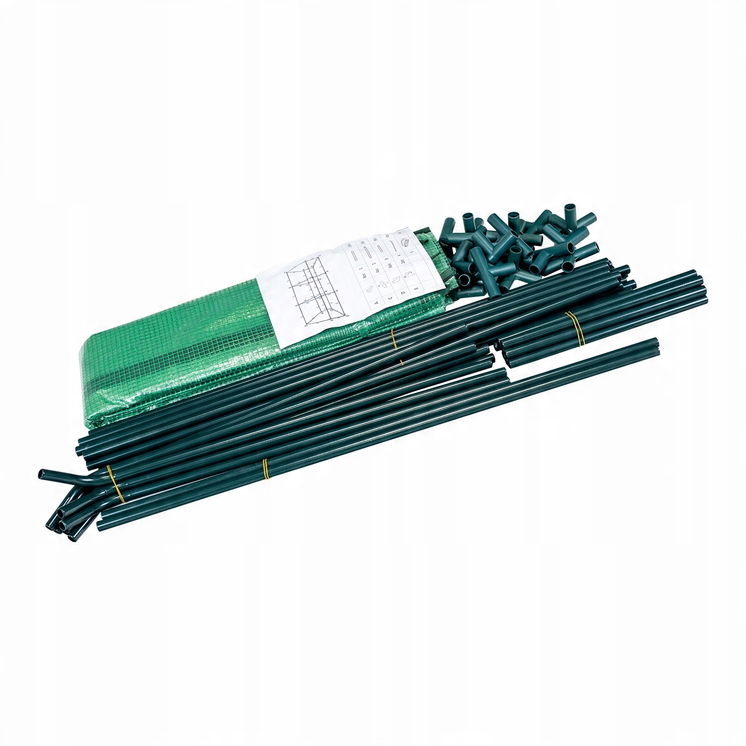 У набір входять усі елементи для складання: труби та з’єднувачі для каркаса, плівка та інструкція.