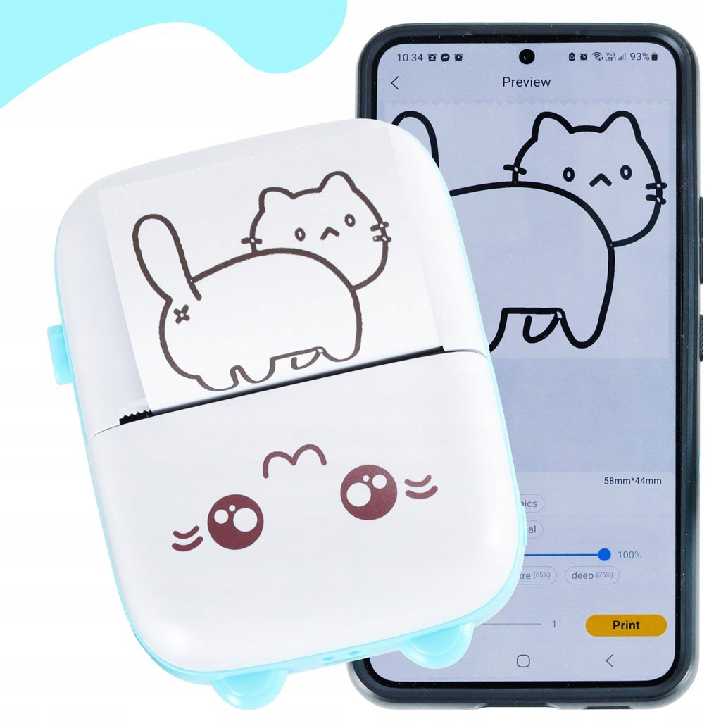 Міні-термопринтер для фотографій етикеток + USB-кабель котячого синього кольору