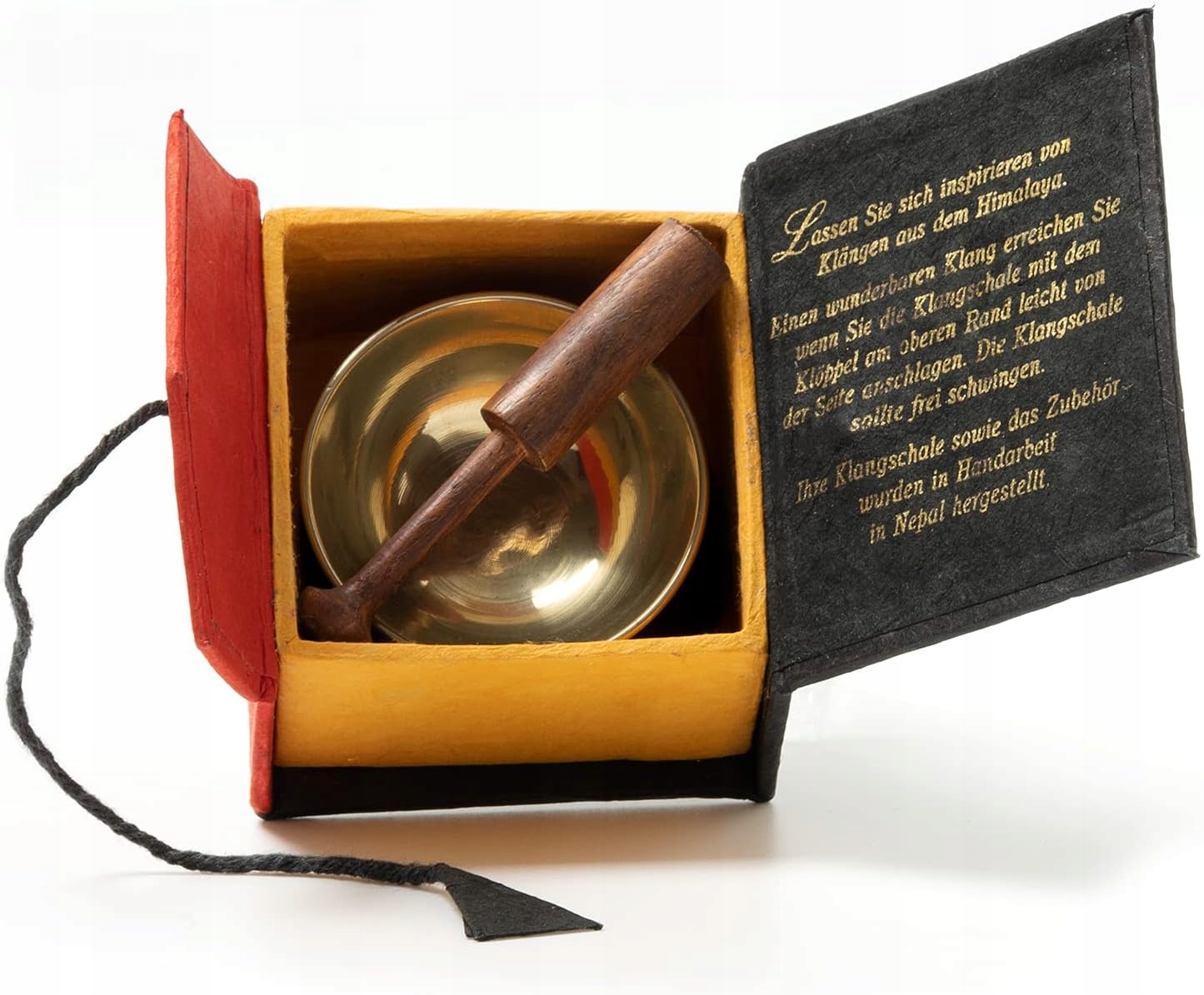 - Невеликий подарунковий набір: міні-співаюча чаша діаметром приблизно 5 см, чорна подушечка Ø приблизно 5 см, міні-дерев'яна паличка для їжі, коробка виготовлена з екологічного паперу ручної роботи в Непалі.