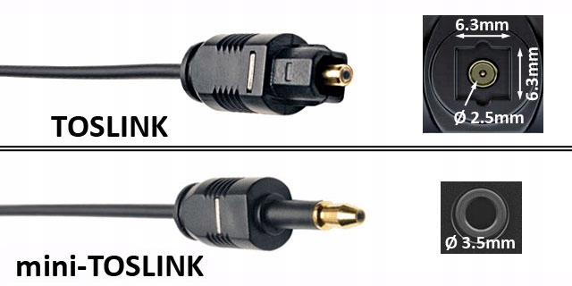 - mini-TOSLINK (оптичний JACK3.5) - менші круглі роз'єми, розмір роз'єму JACK3.5мм, найчастіше використовуються в ноутбуках.