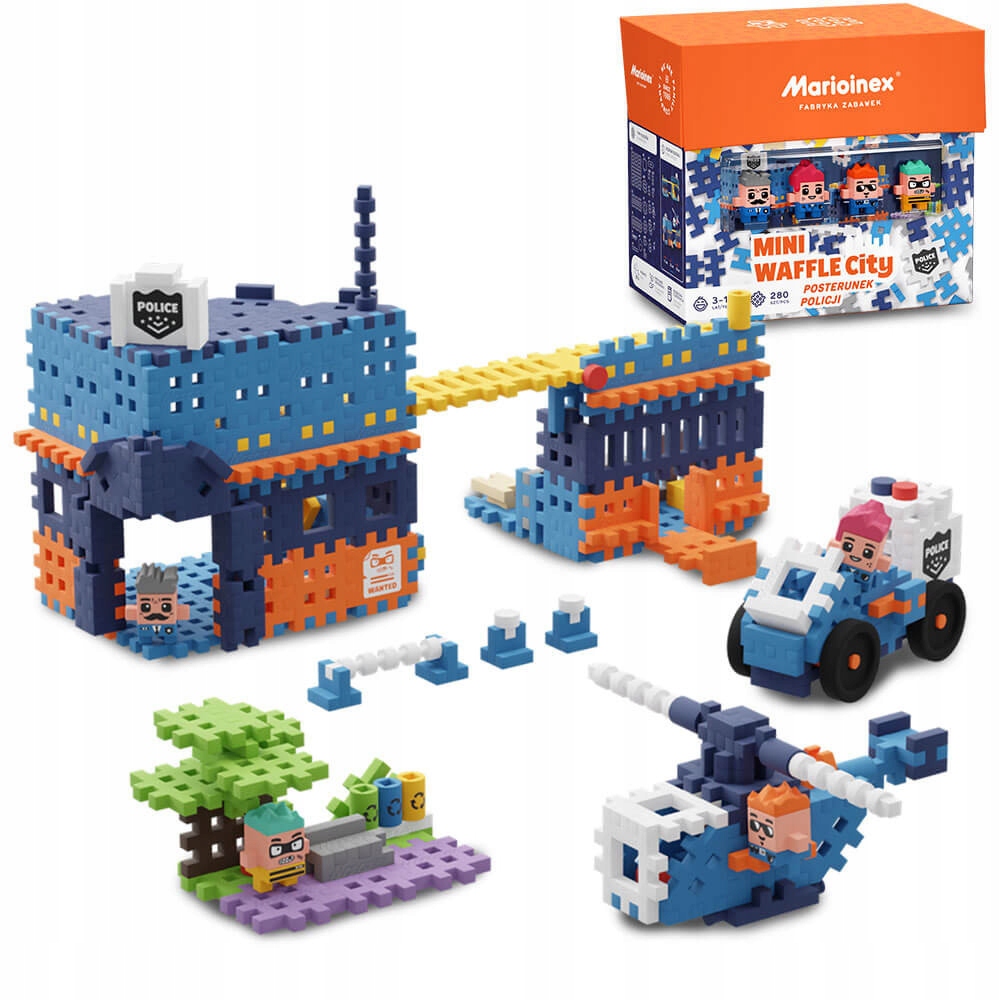 Це ще один набір тематичних блоків із серії Marioinex Waffle CITY та чергова частина культових битв між добром і злом, тобто поліцейськими та злодіями. Новий набір Поліцейська станція з вафельними кубиками Minie - чудова ідея для дітей як розвиваюча іграшка та чудова розвага для всієї родини. Набір блоків складається з 280 штук. і представляє іншу історію та події в місті WAFFLE CITY.