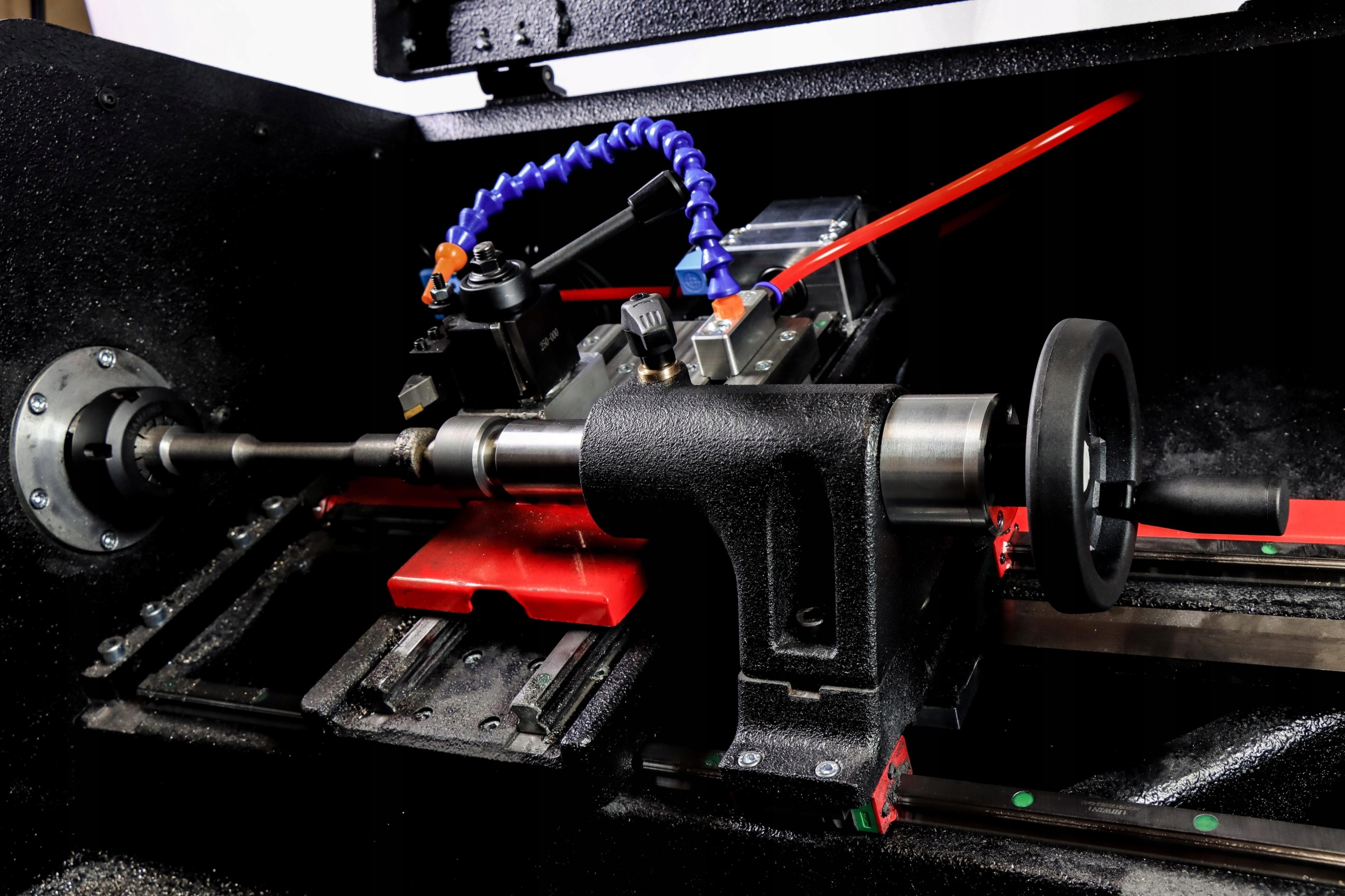 Наш верстат має велику робочу площу. Хід осі Z 430 мм, хід осі X 170 мм, діаметр повороту 220 мм над ліжком. Отвір шпинделя діаметром 30 мм.