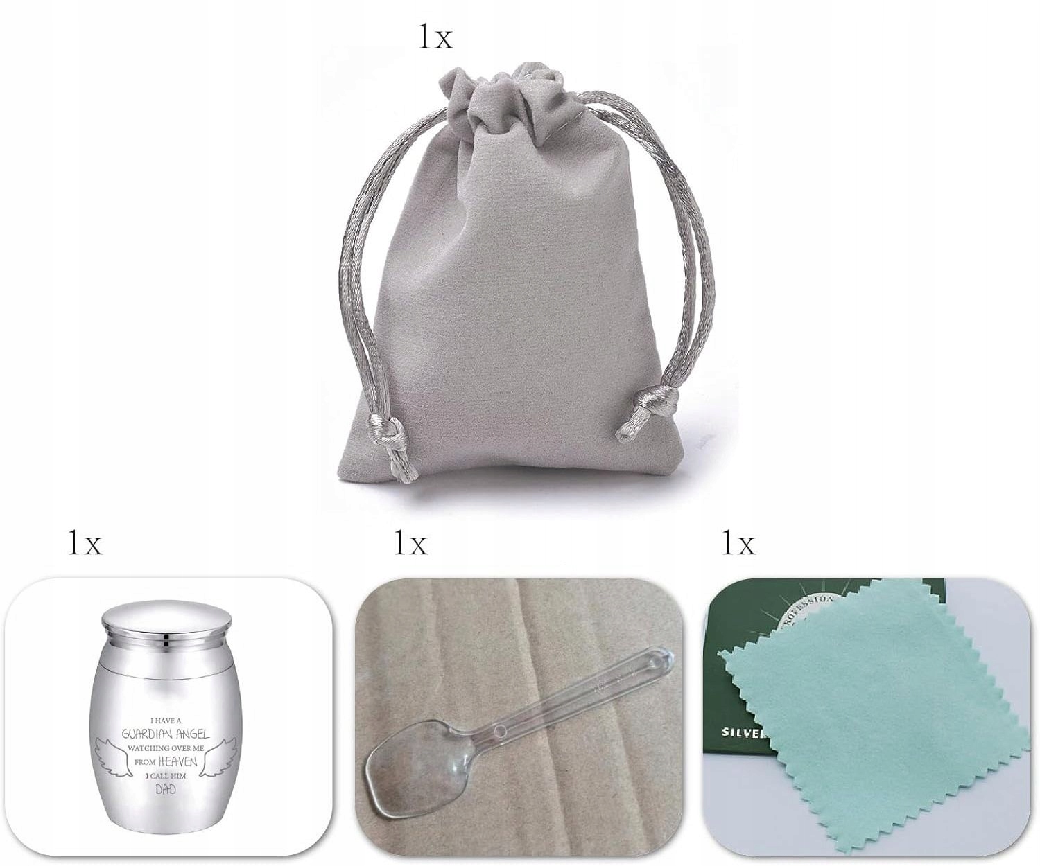 - Малий розмір урни: 1 штук X міні -урна в сувенірах: 1,57x1,18 дюйма (40x30 мм); 1 шматок x Вельветна сумка: 2,8 x 3,7 x 0,16 дюйма / 70 ~ 72 мм x 92 ~ 95 мм x 4 мм; Срібна шліфувальна тканина: 3х3 дюйми/75x75x4 мм. 75 мм; 1, 7 штук х пластикова ложка: 3,3 x 0,90 08 дюймів / 86 x 23 x 2 мм. Міні -урна підходить для транспортування невеликої кількості попелу (приблизно 11,7 мілілітра).