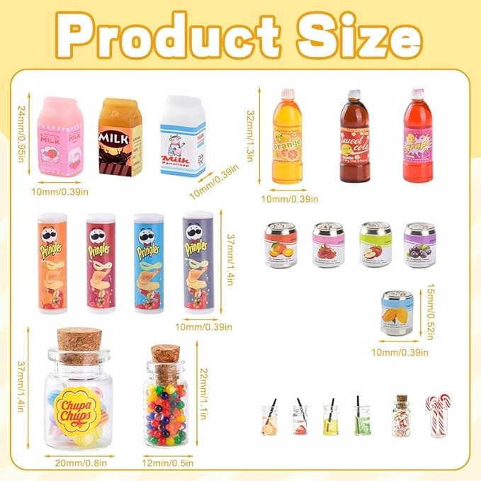 - Міні -цукровий напій - 24 мініатюрні частини для їжі та пиття, включаючи 4 склянки для картопляних чіпсів, 3 молочні коробки, 4 мішки для картопляних чіпсів, 1 склянки до льодяників, 1 чашка для солодощів, 3 пляшки з напоями, 5 фруктових напоїв, 4 міні -соки, 1 попку, 1 міні -джар для солодощів (включаючи цукерки), 1 кліна цукру. Мініатюрні аксесуари для гномів доступні в широкому діапазоні та в різних кольорах, щоб ввести різноманітність у ваш ляльковий будинок та відповідати всім вимогам для мініатюрної кухні.