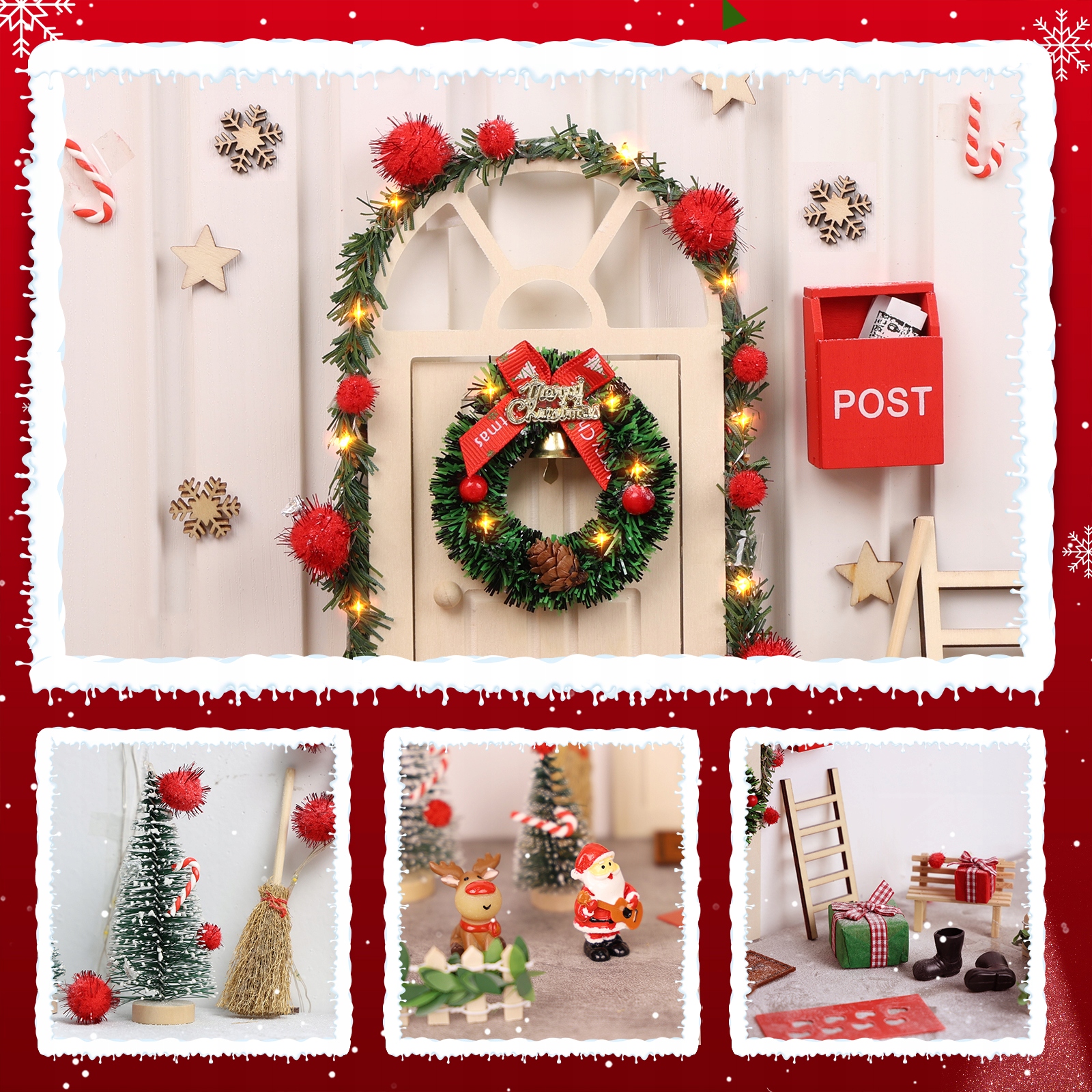 4 шишки*1, вітамін*1, великі сходи*1, червона мітла*1, cane*2, поштова скринька*1, папір компанії*1, фон сніжинок*3, фон із зірок*3, кольоровий світловий шнур*1, Світлодіодний світловий шнур*1, огорожа*2, лист 30 см*1, стілець*1, упаковка з червоного хутряного кулі (великі 2 см10, невеликий 1 см10)*1, ялинка*2 (7 см/ 8 см), килим*1 , дерев’яні ноги*1, різдвяне взуття*1, коробка*2 (зелений великий маленький червоний), Санта Клаус*1, Різдвяний олень*1