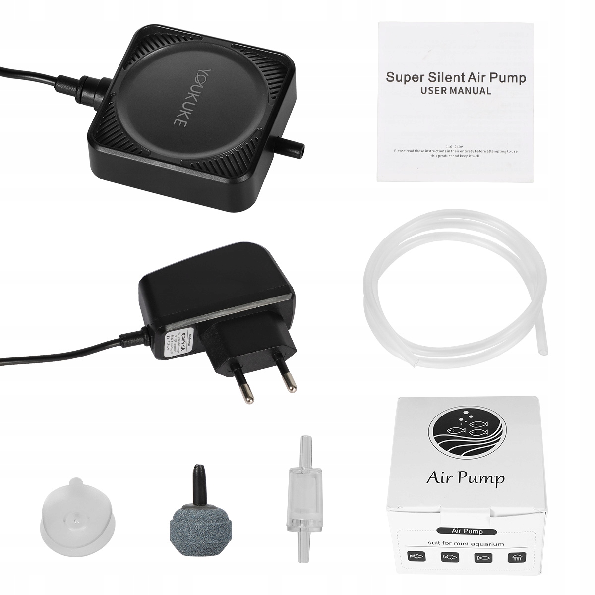 Набір повітряного насоса для акваріума YOUKUKE включає адаптер змінного струму потужністю 1 Вт, повітряну трубку довжиною 1 м, невеликий повітряний камінь, зворотний клапан потоку води, 1 присоску повітряного насоса та посібник користувача.