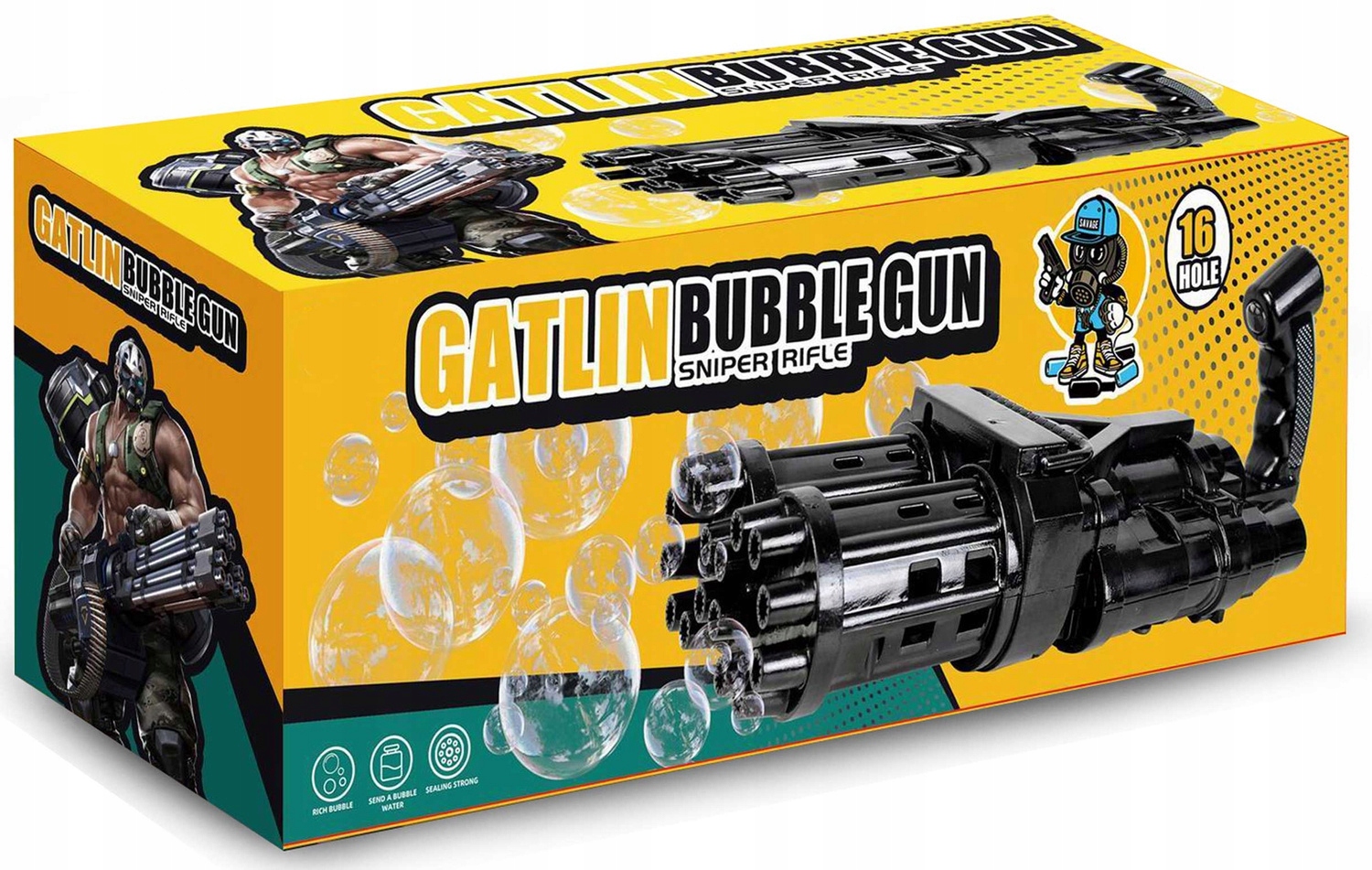 Супер пістолет для мильних бульбашок, який, коли ви натискаєте на курок, випускає багато справжніх бульбашок із усіх 16 отворів. Просто насипте бульбашки в спеціальний піддон, намочіть дуло стволів бластерів, натисніть на спусковий гачок і тисячі бульбашок вилетять з рушниці. Шоу райдужних бульбашок супроводжується світловими ефектами. Чудова іграшка для дівчаток і хлопчиків навесні і влітку.