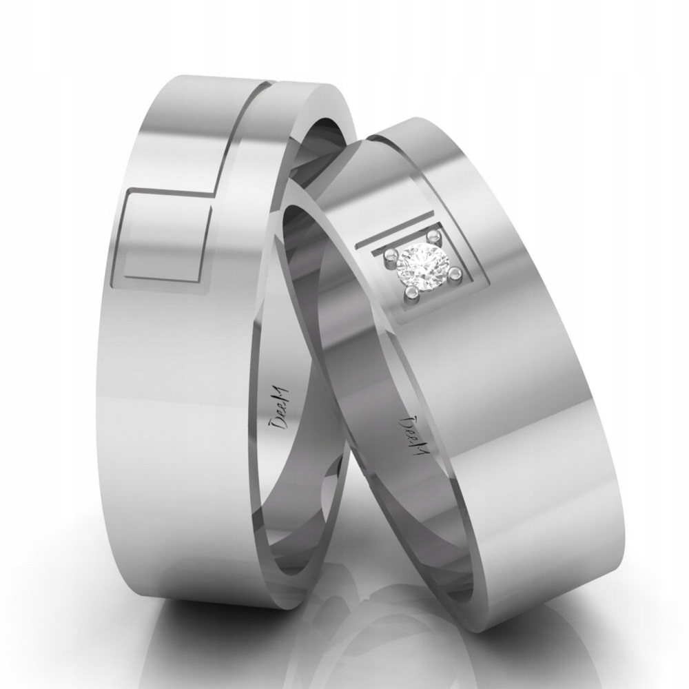 Сучасні обручки з білого золота 14 карат. Вони мають плоский профіль і гладку, блискучу поверхню. Вони прикрашені тонкими геометричними вирізами. Відмінною рисою жіночої обручки є ефектний камінь, розташований в середині візерунка декору.