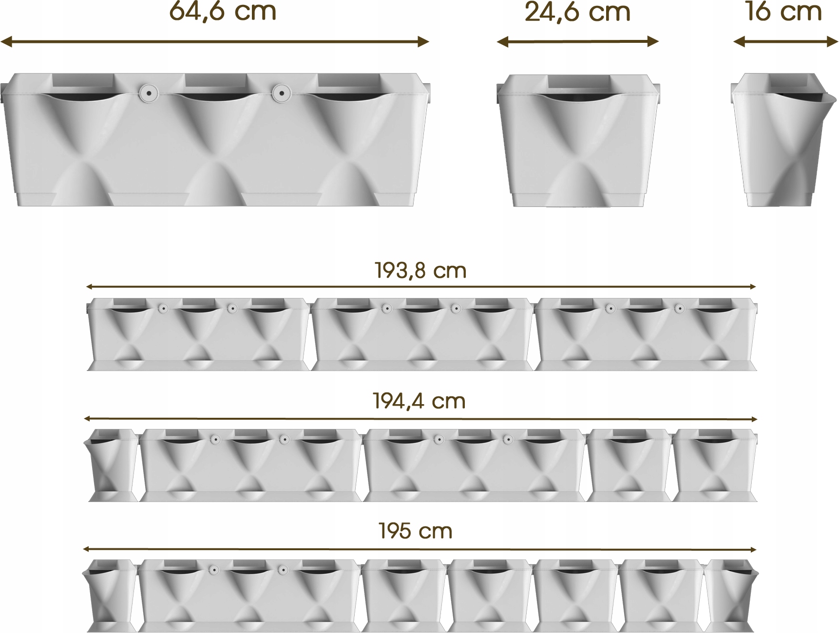 Наша система вертикального вирощування має три типи модулів різної ширини. Якщо з’єднати їх горизонтально, монтажна ширина буде різною залежно від кількості та типу використовуваних модулів.