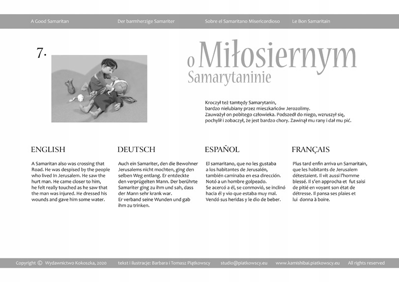 Притча про милосердного самарянина як приклад літературного жанру була розповідана на 10 ілюстрованих картках. Крім того, ця притча про Камішібай включає робочу карту під назвою: "Як ми можемо допомогти, коли хтось відрізає? Коли дасть комусь воду?" - Це хороший привід поговорити з дітьми про правила надання першої допомоги та безпеки.