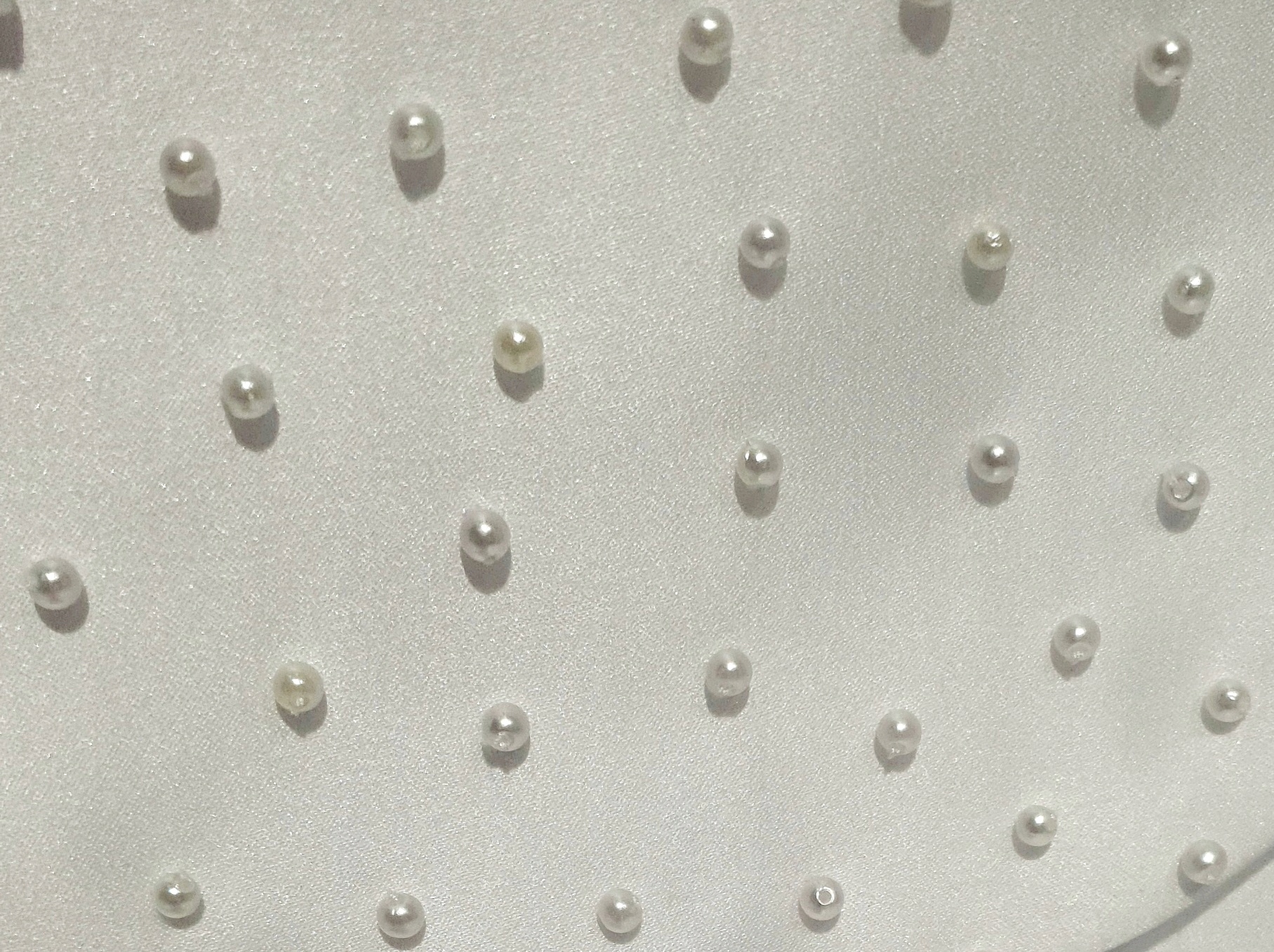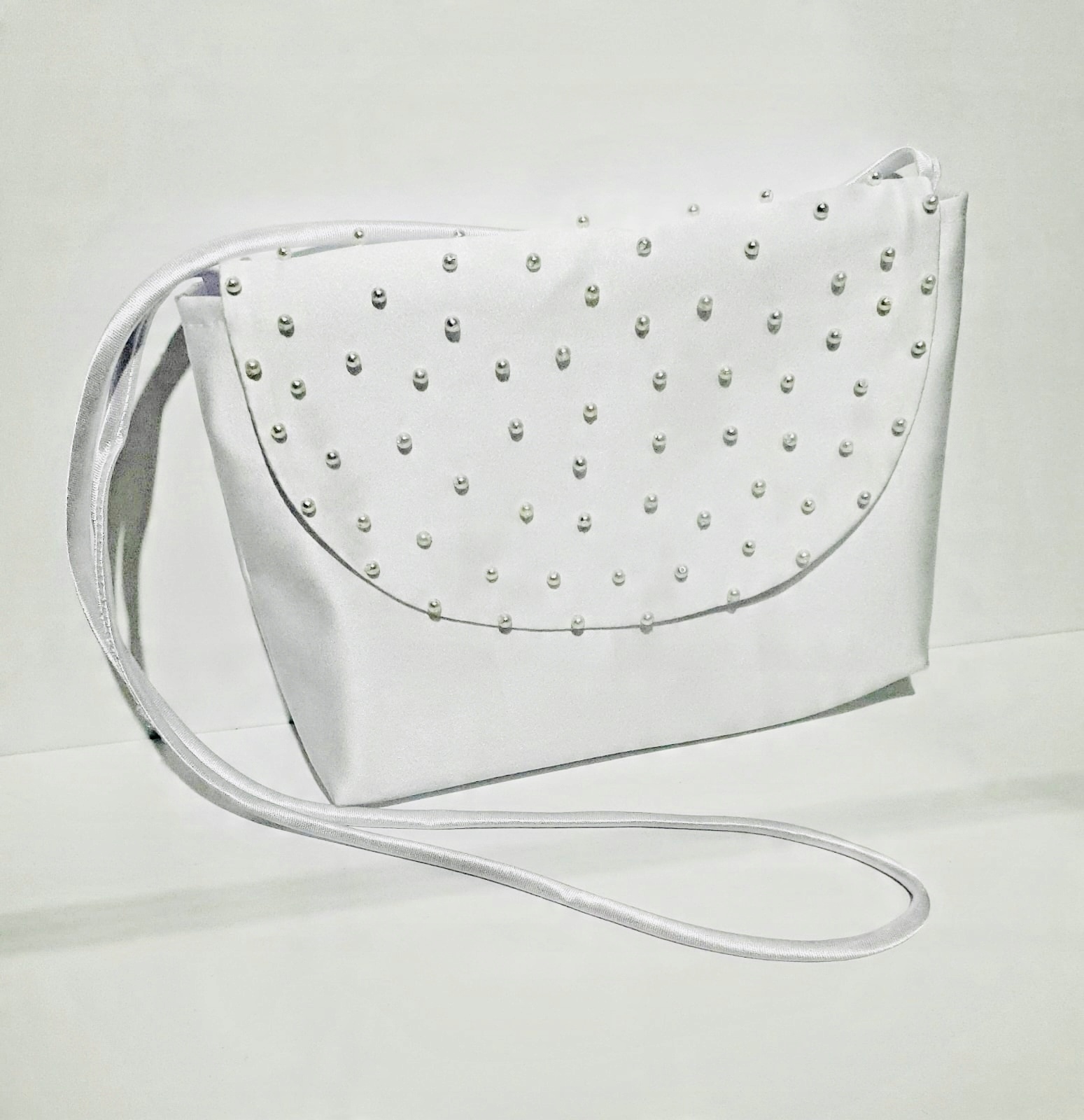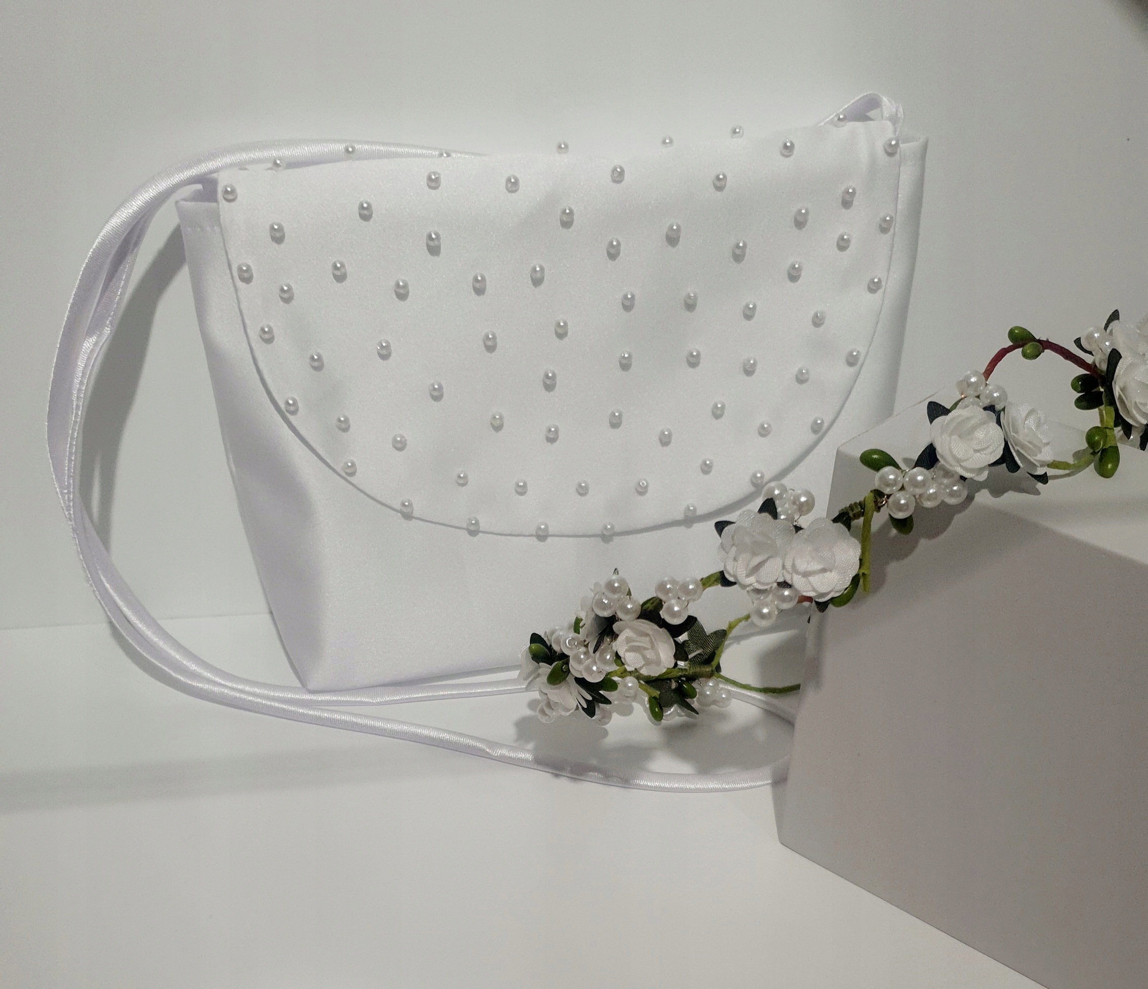 Кошетка для причастя з білої весільної тканини з атласним шнурком для носіння через плече. Сумка гладка, кришка сумки прикрашена перлами, з внутрішньої сторони посилена, що надає їй гарного вигляду. Сумка застібається на липучку.