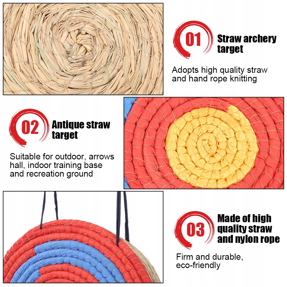 1. Мішень для стрільби з солом'яного лука, виготовлена з високоякісної в'язаної соломи та ручної мотузки, цільна, без з'єднань. 2. Тривалий термін служби, висока якість, відсутність забруднення, відсутність пошкоджень стріл, хороший ефект стійкості до стріл. 3. Антикварна солом'яна мішень, придатна для використання на відкритому повітрі, стрілецького залу, критої тренувальної бази та зони відпочинку. 4. Виготовлений із високоякісної соломи та нейлонової мотузки, міцний та довговічний, екологічно чистий. 5. Професійне виготовлення, стабільні характеристики та висока надійність.
