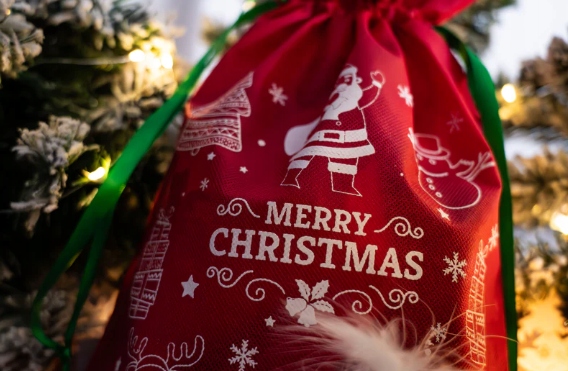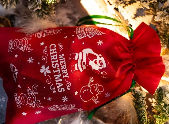✅Подарунковий пакет із різдвяним мотивом, прикрашений декоративною стрічкою.