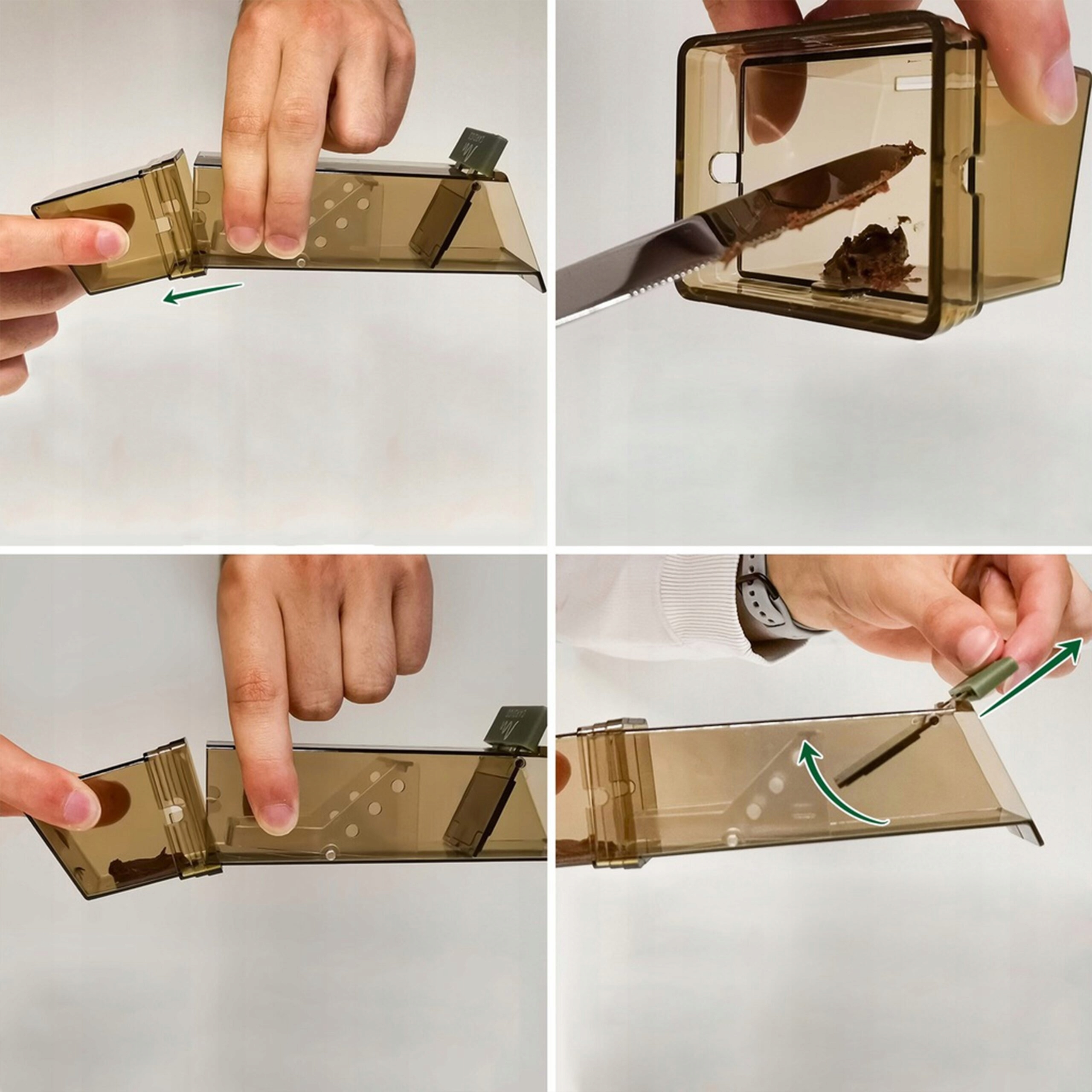Пастка має спеціальний механізм, який пропускає мишу всередину та не випускає її.