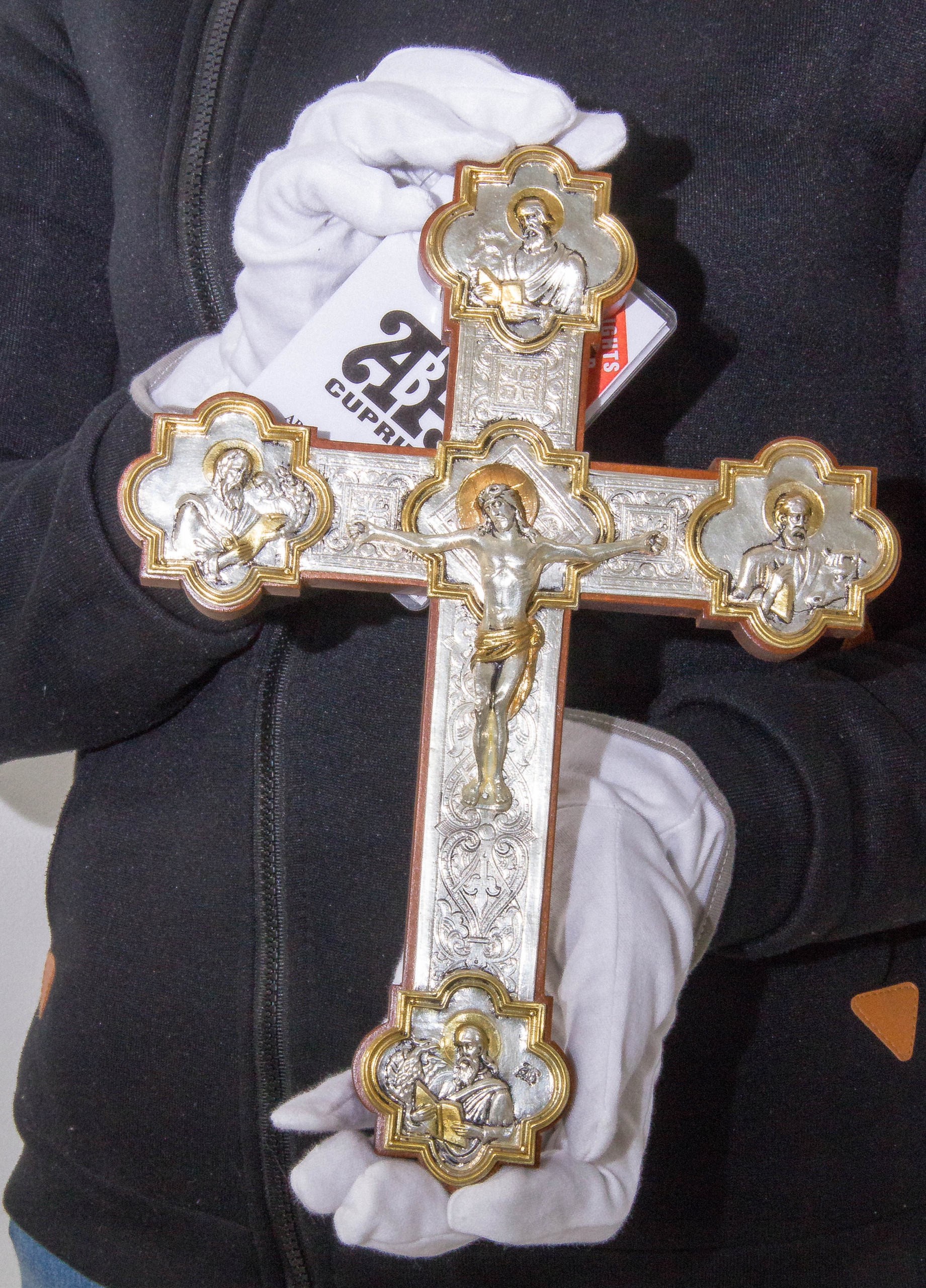 Це класичне місіонерське розп’яття. На плечах Розп’яття є фігури євангелістів. Все вкрите точним декоративним рельєфом. Поверхня посріблена та вибірково позолочена для кращого естетичного ефекту.