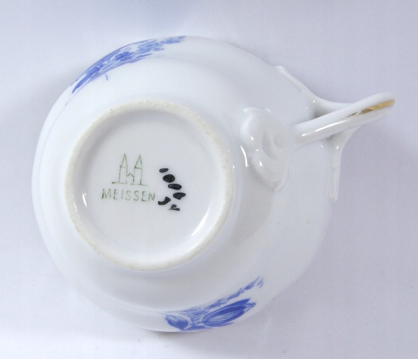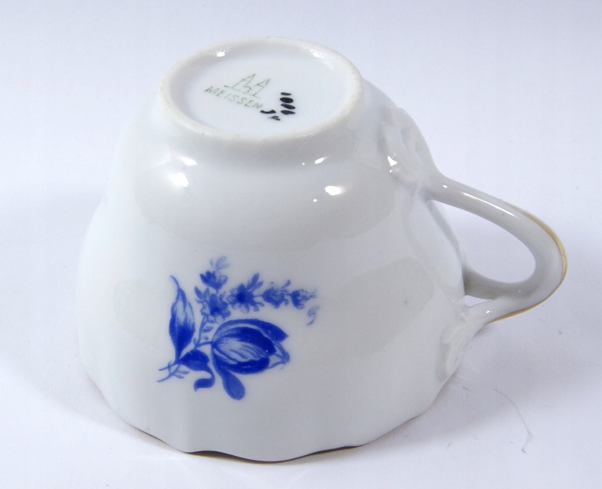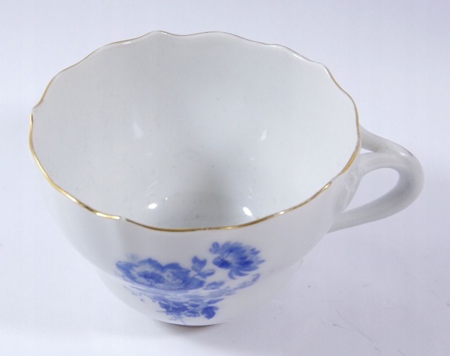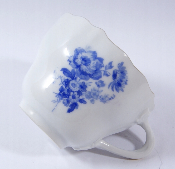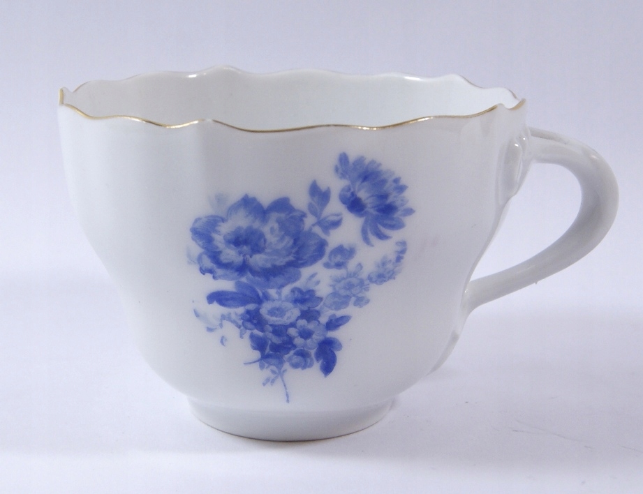 Предметом аукціону є чашка, виготовлена з білої порцеляни, прикрашена синім квітковим візерунком.
