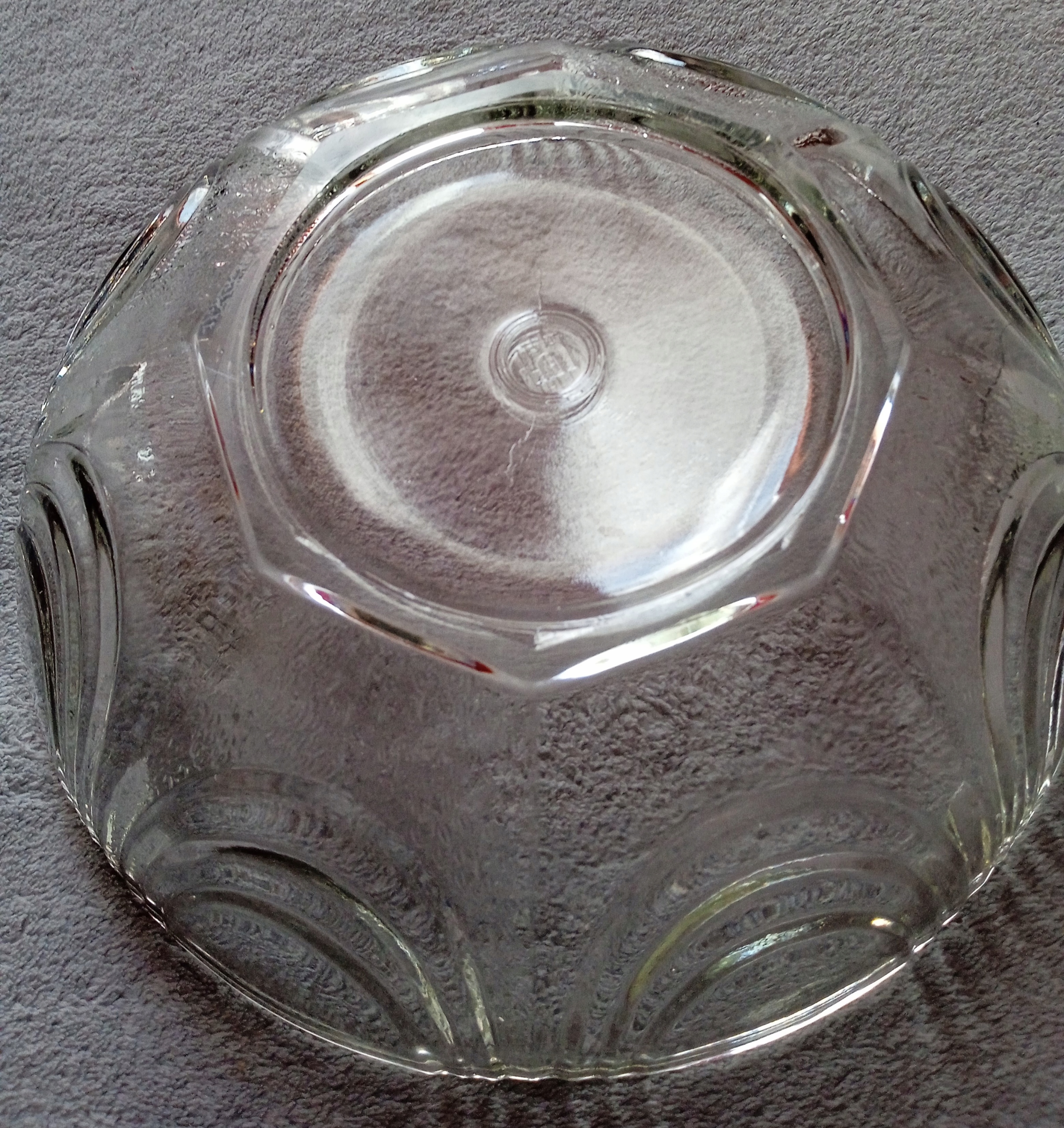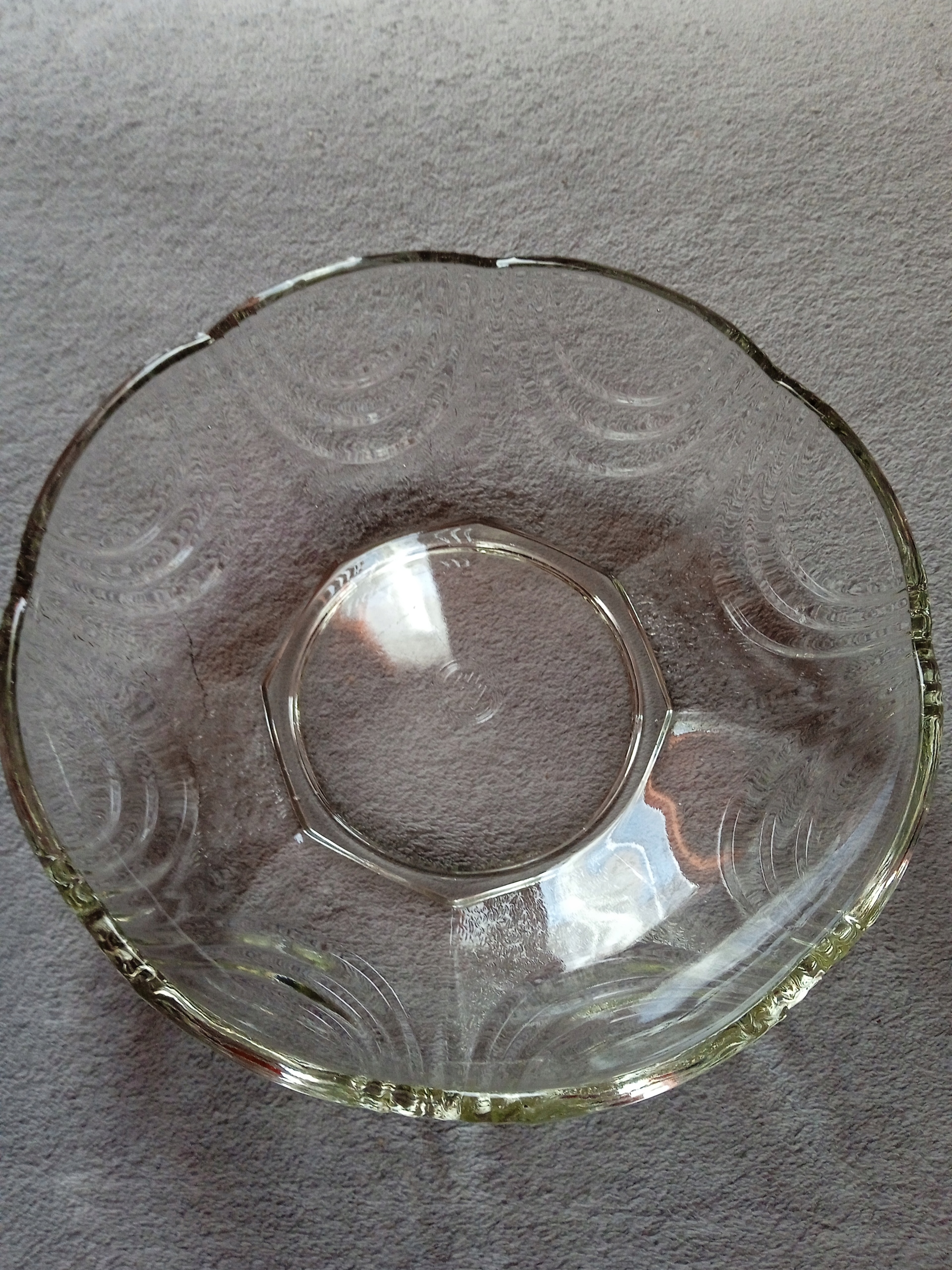 Продам миску арт-деко виробництва металургійного заводу Hortensja. Чаша з прозорого пресованого скла, представлена в каталозі склозаводу 1936 року, підписана в центрі дна відбитком логотипу склозаводу: замок з трьома вежами, літера Н посередині воріт знак, що використовувався в період Польської Народної Республіки. Днище в профілі восьмикутне. Висота 7 см. Діаметр 22,5 см. Діаметр дна 11,4 см. Стан хороший, посередині днища та збоку є дрібні та не дуже помітні експлуатаційні подряпини, видно на фото.