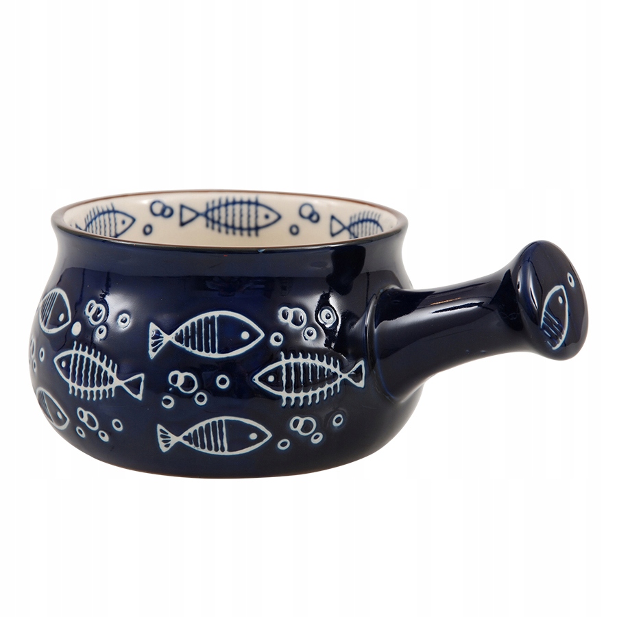 Супниця керамічна зі зручною ручкою, виготовлена з високоякісної кераміки. Прикрашений нанесеним вручну морським візерунком темно-синього та кремового відтінків. Мотив риби та бульбашок надає їй веселий приморський характер, ідеально підходить для середземноморської чи сільської кухні.