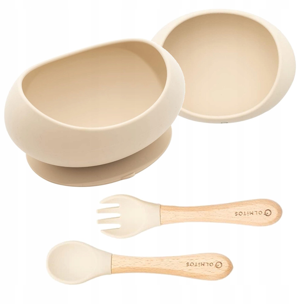 Обідній набір із 3 предметів від іспанського бренду OLMITOS. Ідеально підходить для використання при розширенні раціону дитини. Виготовлений з високоякісного 100% харчового силікону, що відповідає суворим німецьким вимогам LFGB. Миска має міцну присоску, яка запобігає висипанню її вмісту під час їжі. Спеціальний язичок полегшує від'єднання присоски. Столові прибори мають закруглені та м'які краї, щоб не дратувати ніжні ясна дитини. Їхні ручки виготовлені з деревини бука.