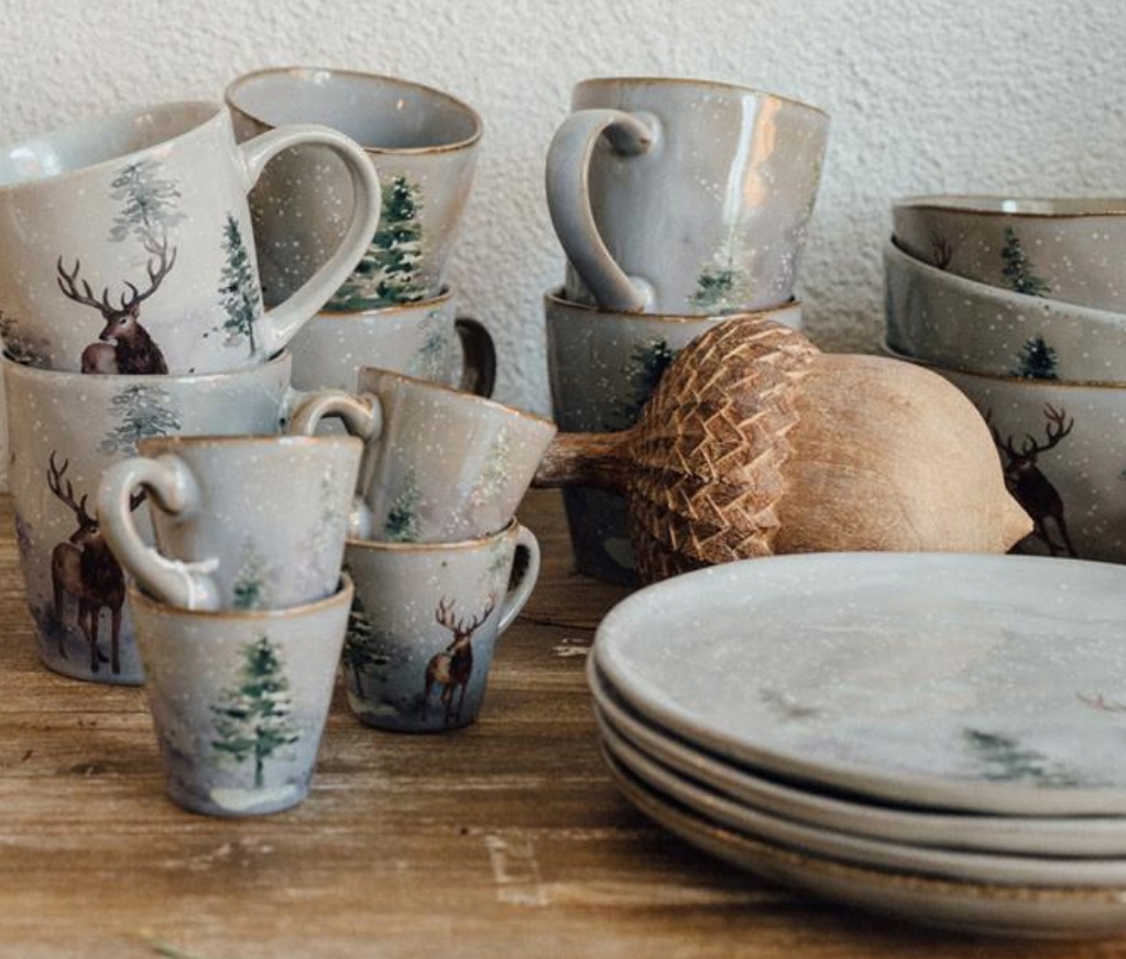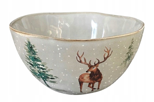 Сіра керамічна миска. Зовні прикрашений декоративним зимовим мотивом. Він буде працювати як вишуканий і приємний для ока декоративний акцент і як функціональне доповнення до різдвяного столу, подаючи фрукти, солодощі чи закуски разом із теплим чаєм зимовим вечором. Завершений набір із кількох елементів із цієї серії дозволить створити іншу, нову декоративну композицію під час спільного застілля та святкування кожного разу.