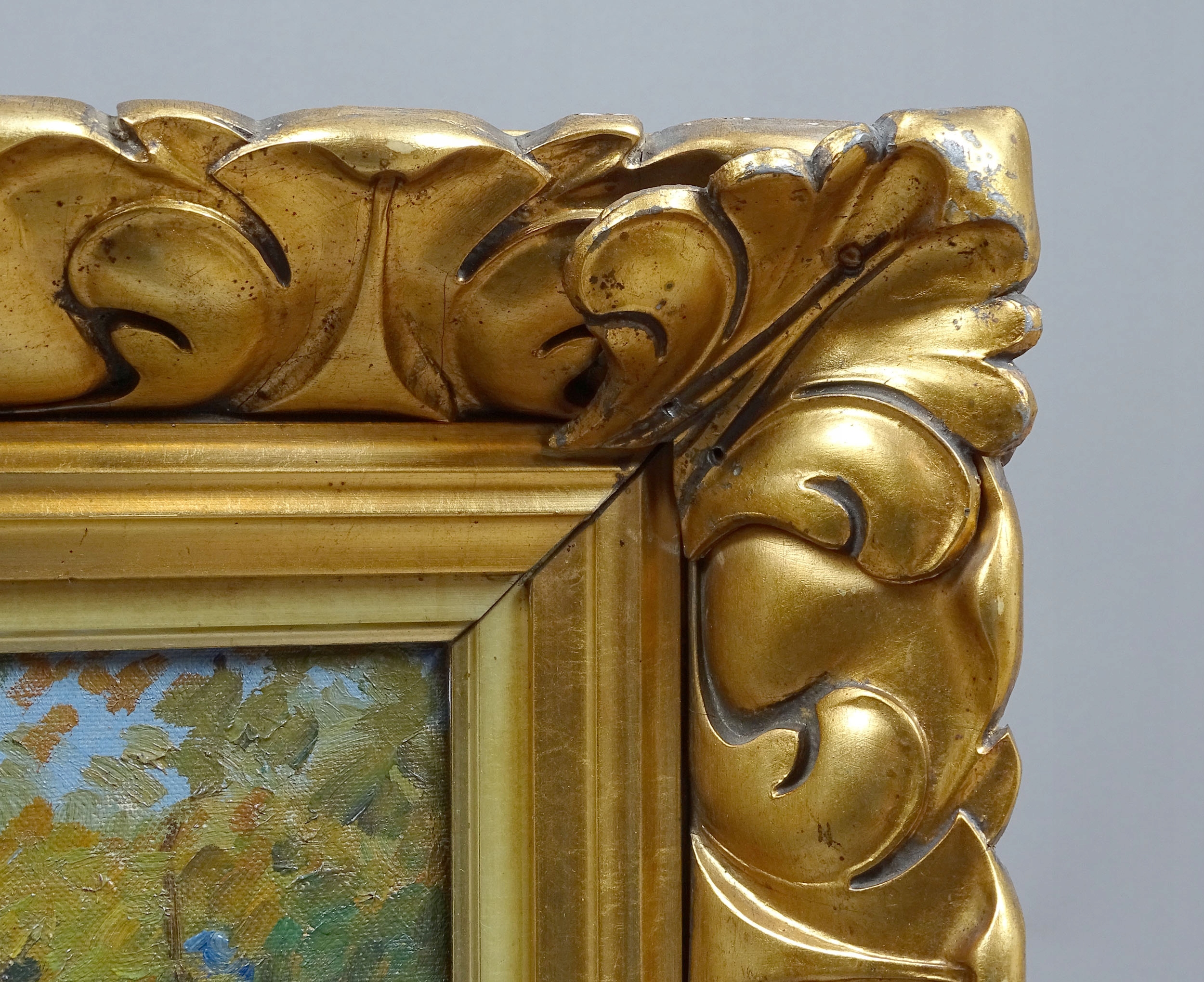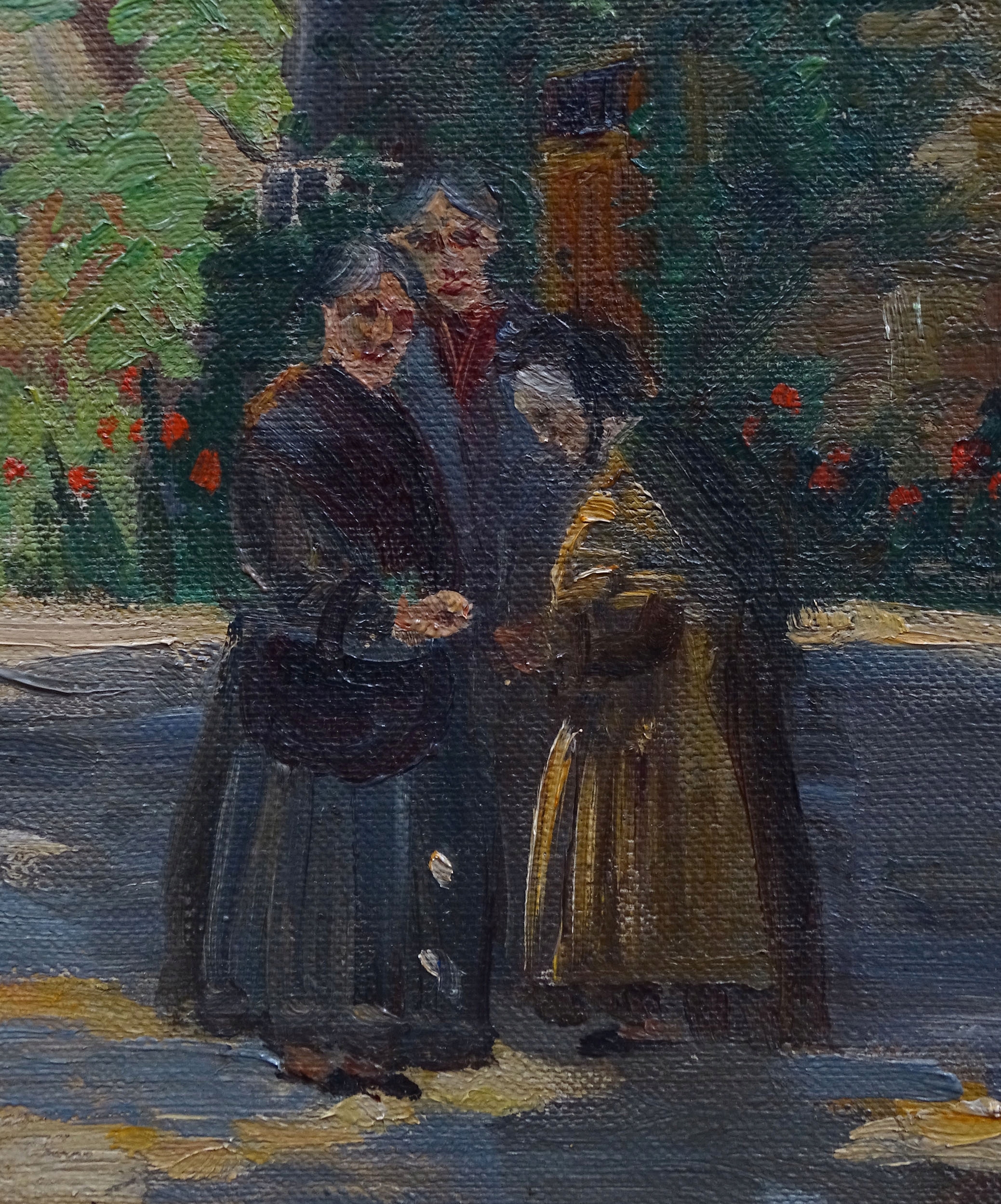 Картина, на якій показано трьох жінок, які стоять посеред площі, і ще трьох, які сидять на лавці зліва. Навколо типові будівлі середнього класу з церквою на задньому плані та кількома деревами. Каркас трохи виступає вперед, з позолотою та прикрасами у вигляді листя. Чотири латунні аплікації по кутах рами.