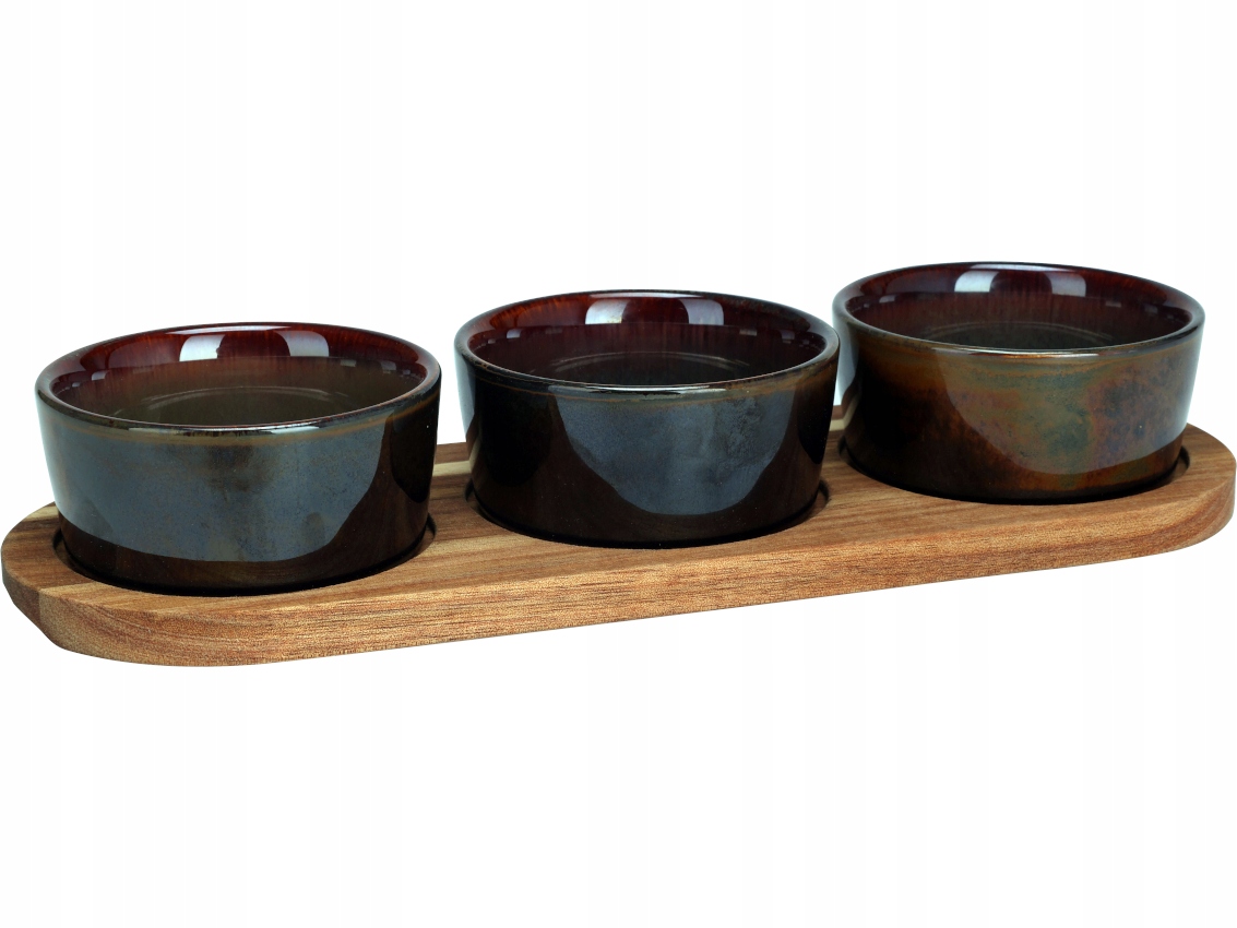 Набір із 3 керамічних мисок на підносі з дерева акації — для подачі оливок, горіхів, закусок і соусів. Також ідеально підходить для солодких міні-десертів.