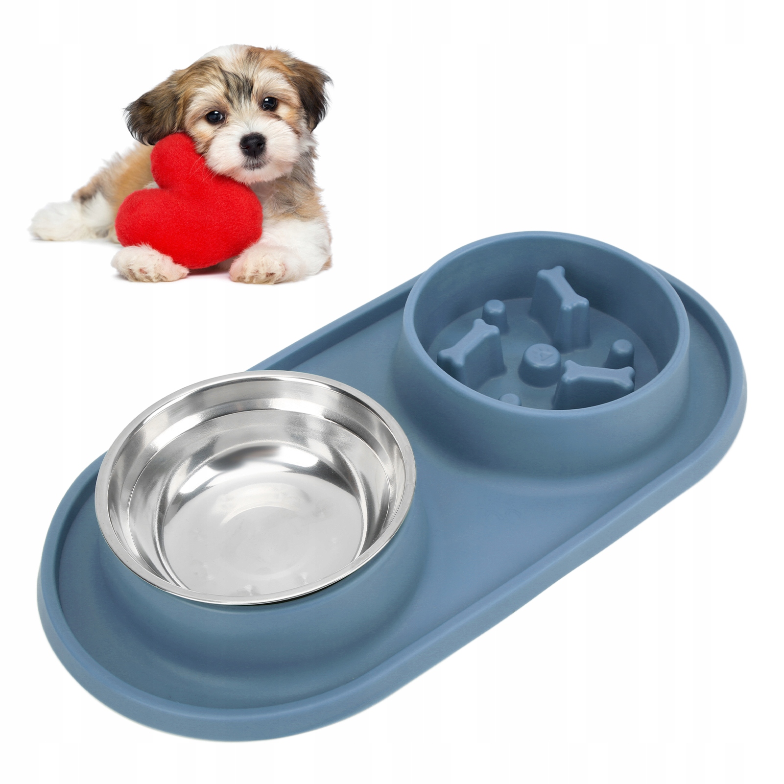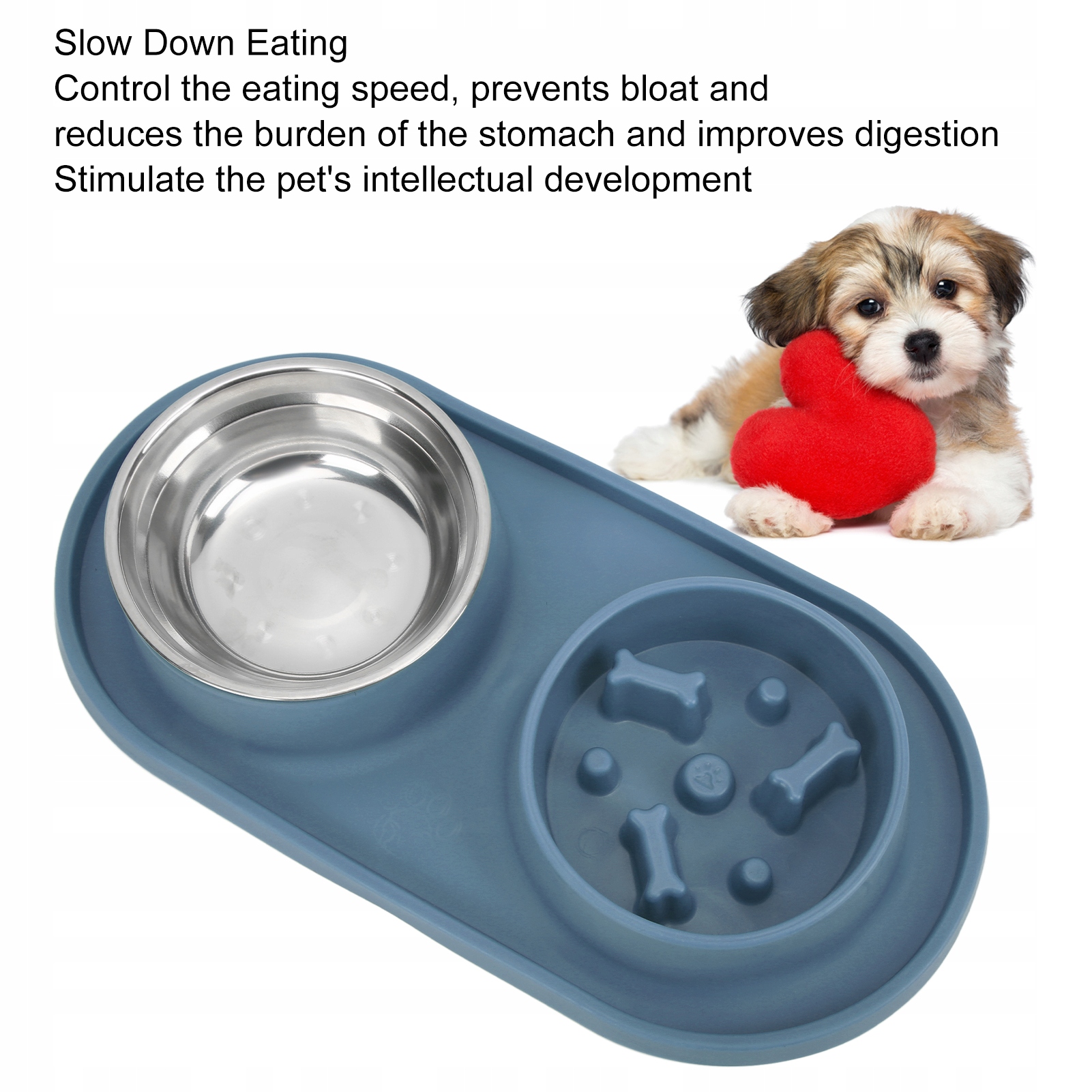 2. Миски для їжі та води: піднятий край еквівалентний піноутворенню, ефективно запобігає розсипанню їжі та води на землю. Одна сторона – це миска для повільного годування для зберігання їжі, інша сторона – миска з нержавіючої сталі для води.