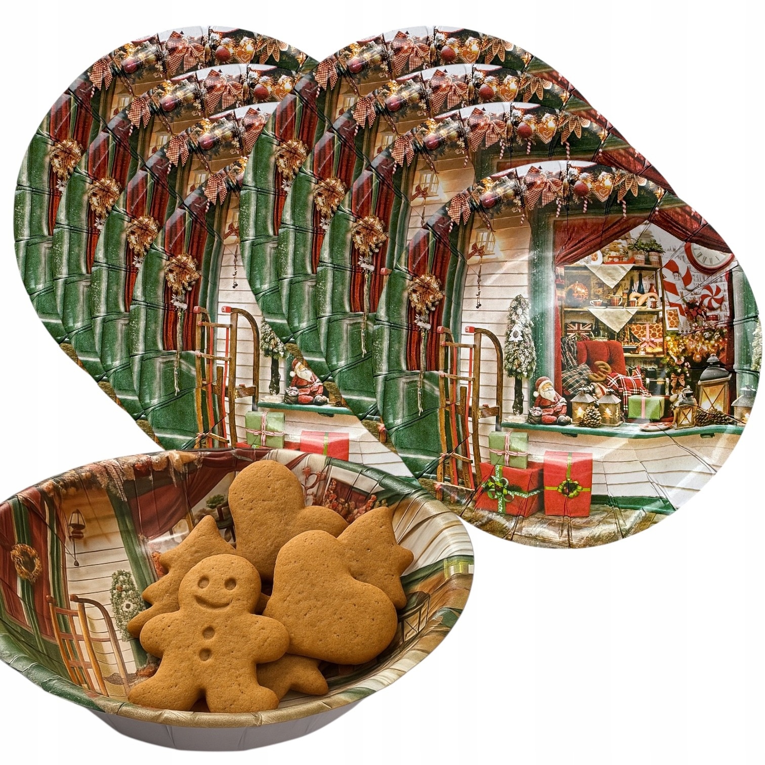 Набір містить 8 мисок із красивим класичним різдвяним мотивом із зображенням подарунків, саней, прикрас і зимового декору в теплих кольорах.