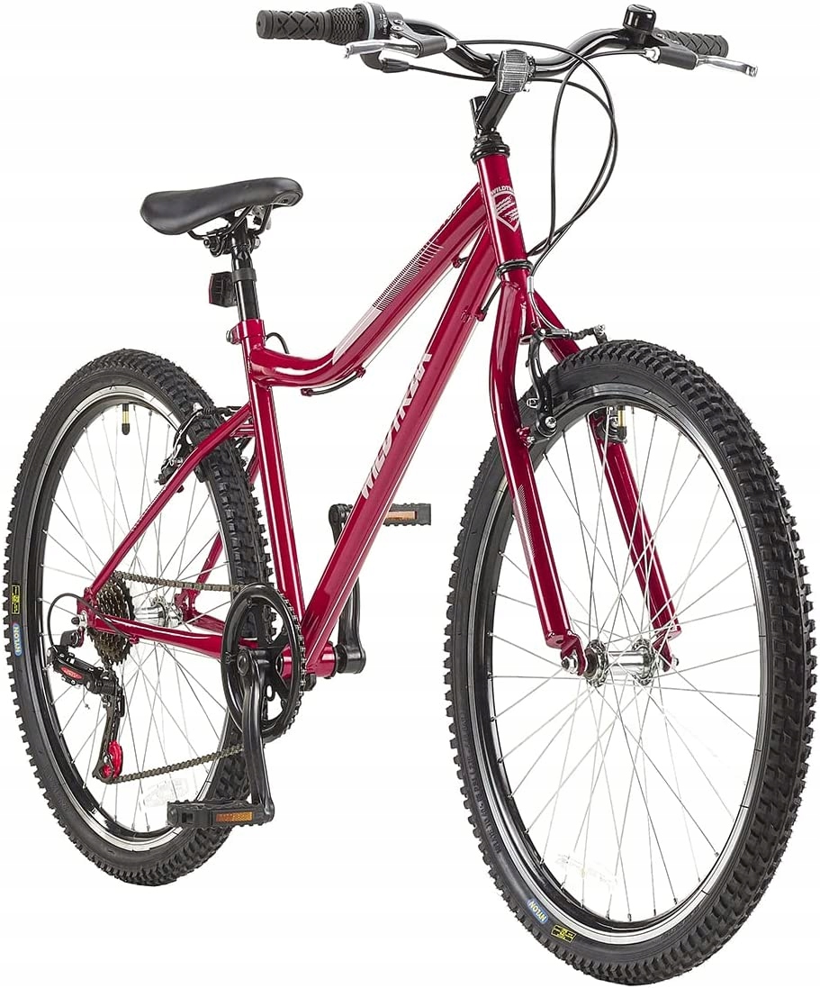 Цей 18-швидкісний жіночий велосипед із колесами 66 см (26 дюймів) має раму 47 см і доступний у бордовому кольорі