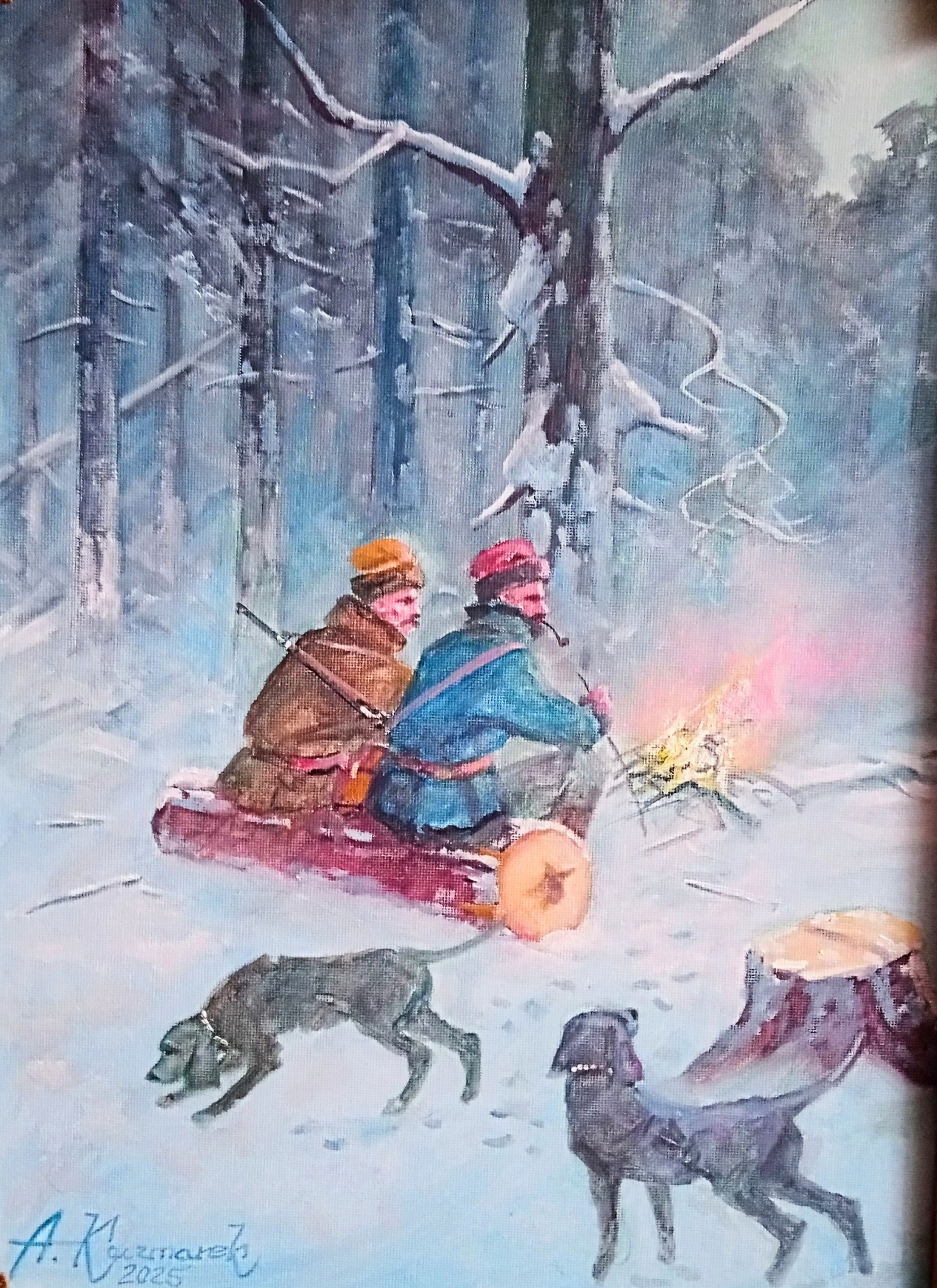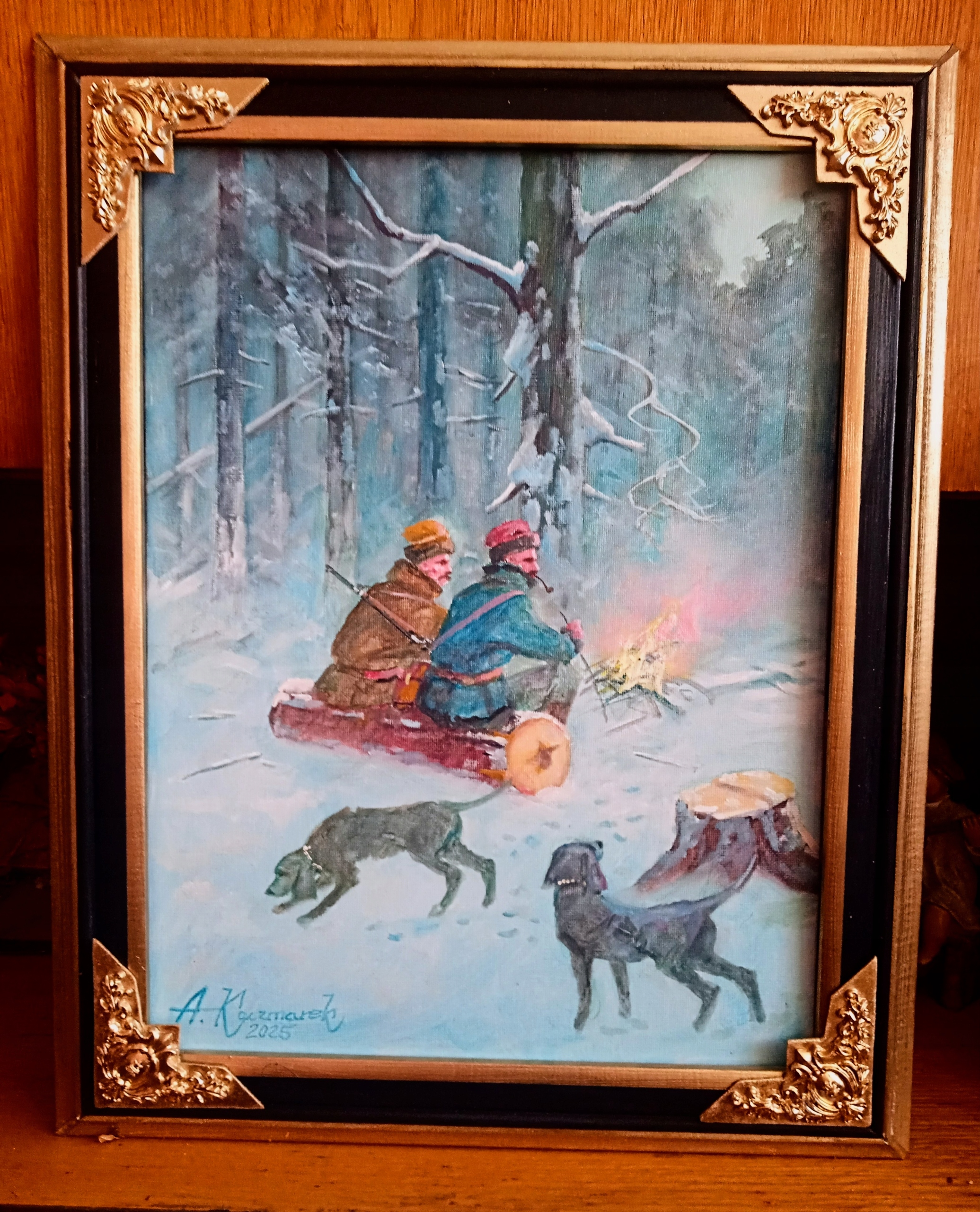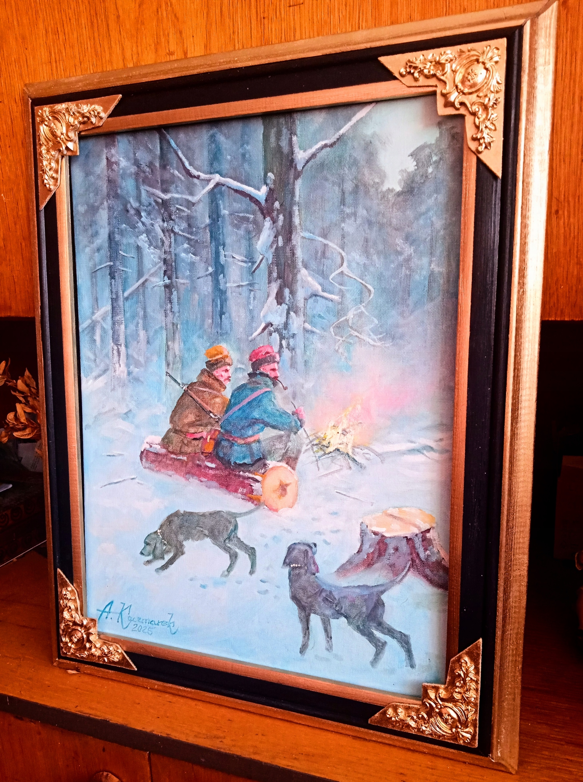 МИСЛИВЦІ БІЛЯ ВОГНЯ - АНДРЖЕЙ КАЧМАРЕК - АКАДЕМІЯ ОБРАЗОТВОРЧОГО МИСТЕЦТВА. КАРТИНА НА ПОЛОТНІ, НАКЛЕЄНА НА ЖОРСТКОМУ КАРТОНІ/НЕ Є РЕПРОДУКЦІЄЮ АНІ ПРИНТОМ, ТІЛЬКИ ПОЛОТНОМ. У ЛІВОМУ НИЖНЬОМУ КУТІ Є ПІДПИС А.КАЧМАРЕК - ДОДАЄТЬСЯ ПИСЬМОВЕ ПІДТВЕРДЖЕННЯ МОГО АВТОРА. РАМКА ЯК НА ФОТО