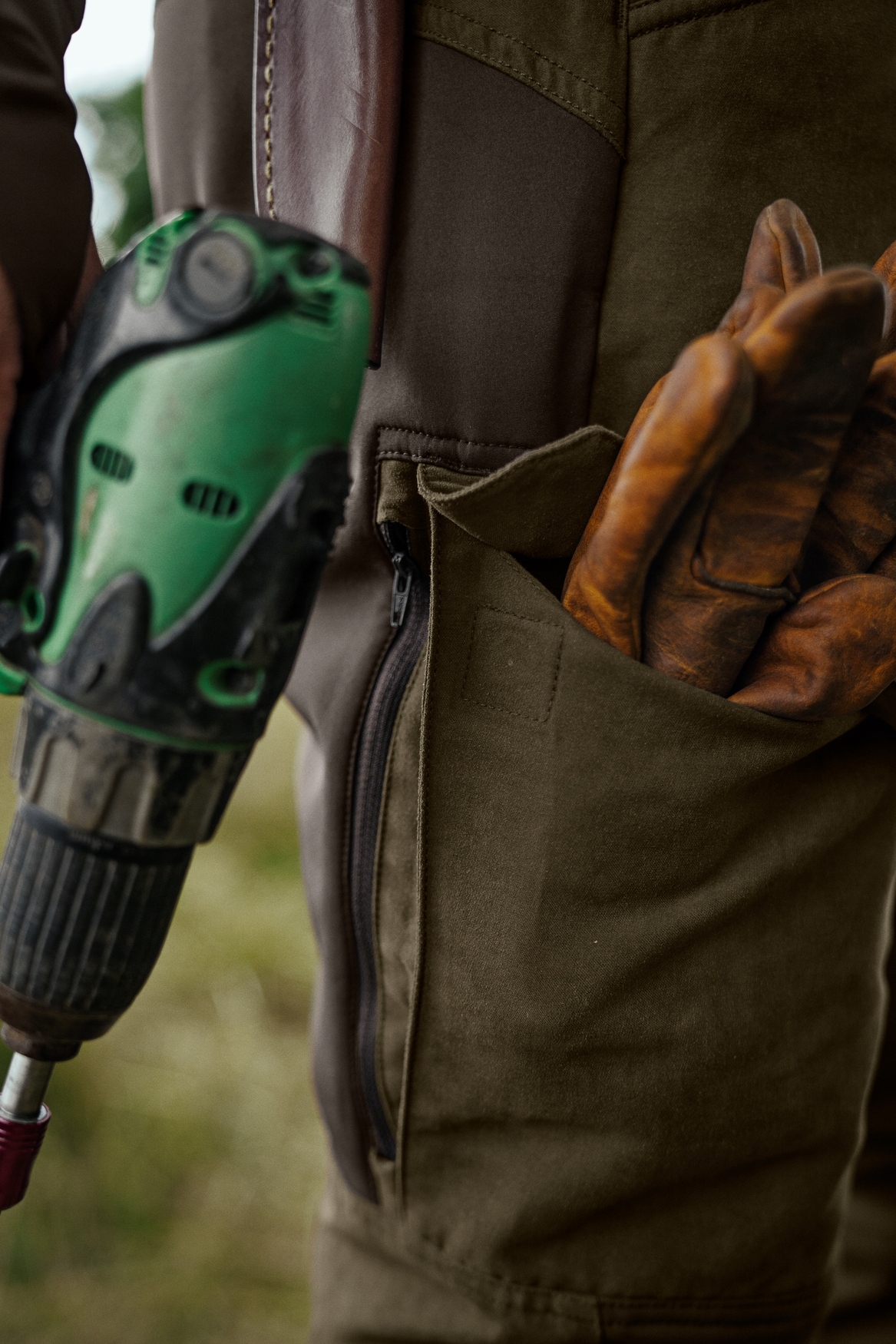 Скандинавські штани Härkila Вони виготовлені з дуже тихої, м’якої, міцної та швидковисихаючої суміші бавовни та поліестеру. Вони мають активний крій з еластичним поясом і панеллю, що тягнеться на сідниці, коліна і стегна. Вони надзвичайно зручні як під час прогулянок, так і на тихому полюванні. Крім того, вони мають багато функцій, які швидко стануть для вас безцінними.