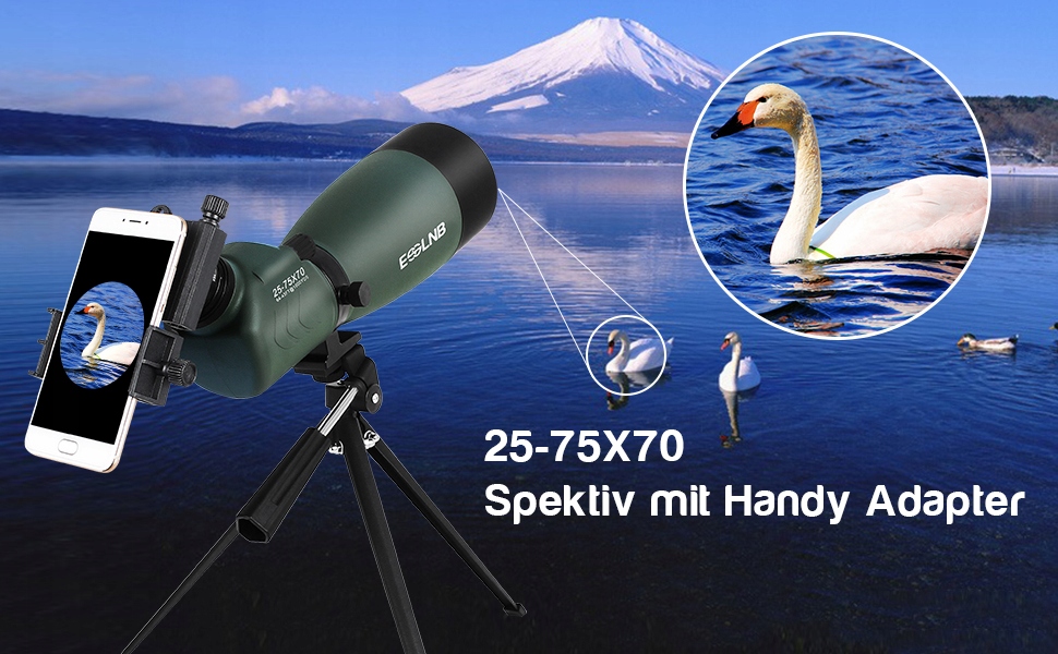 ESSLNB 25-75x70 Спортивні стрілялки Полювання та спостереження за птахами 45 класів Кутовий окуляр Водонепроникний BAK4 з адаптером Рятувальний штатив для мобільних телефонів і рюкзак Збільшення: 25x-75X Діаметр об’єктива: 70 мм Діаметр OCulard: 15 мм Призма: Bak4 Porro Відстань: 16-13 мм Вихід Зіниця: 4 мм при 25-кратному збільшенні, 1,33 мм при 75-кратному збільшенні поля зору: 43-64 футів/1000 м. Відстань у близькому фокусі: 5 м/18 футів Діоптрійне середовище: -4d~+4D Оптичне покриття: водонепроникне з повним покриттям, водонепроникне, протитуманне та ударостійке