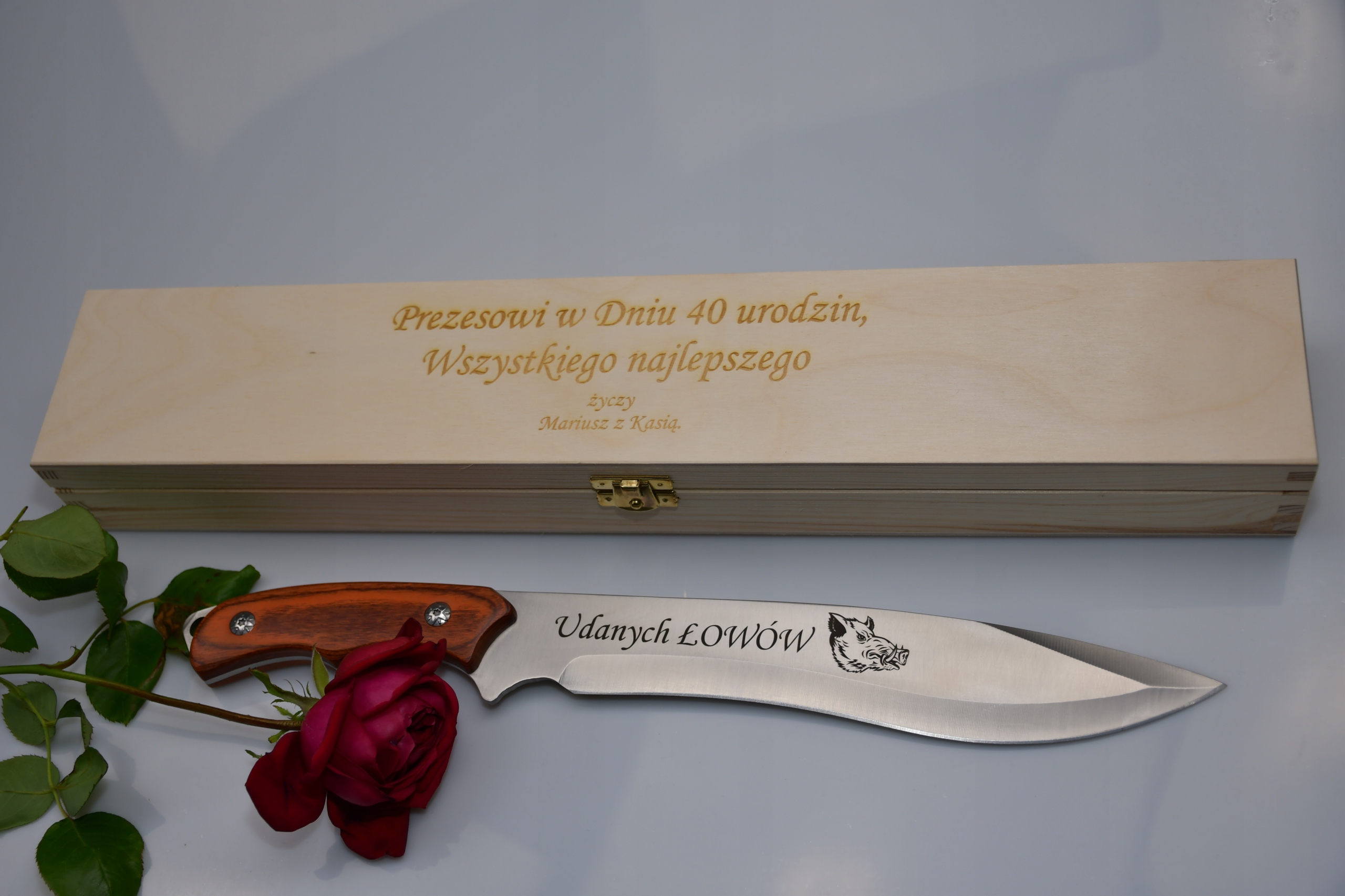 Великий елегантний мисливський ніж з вашим гравіюванням в елегантній лакованій дерев'яній коробці.