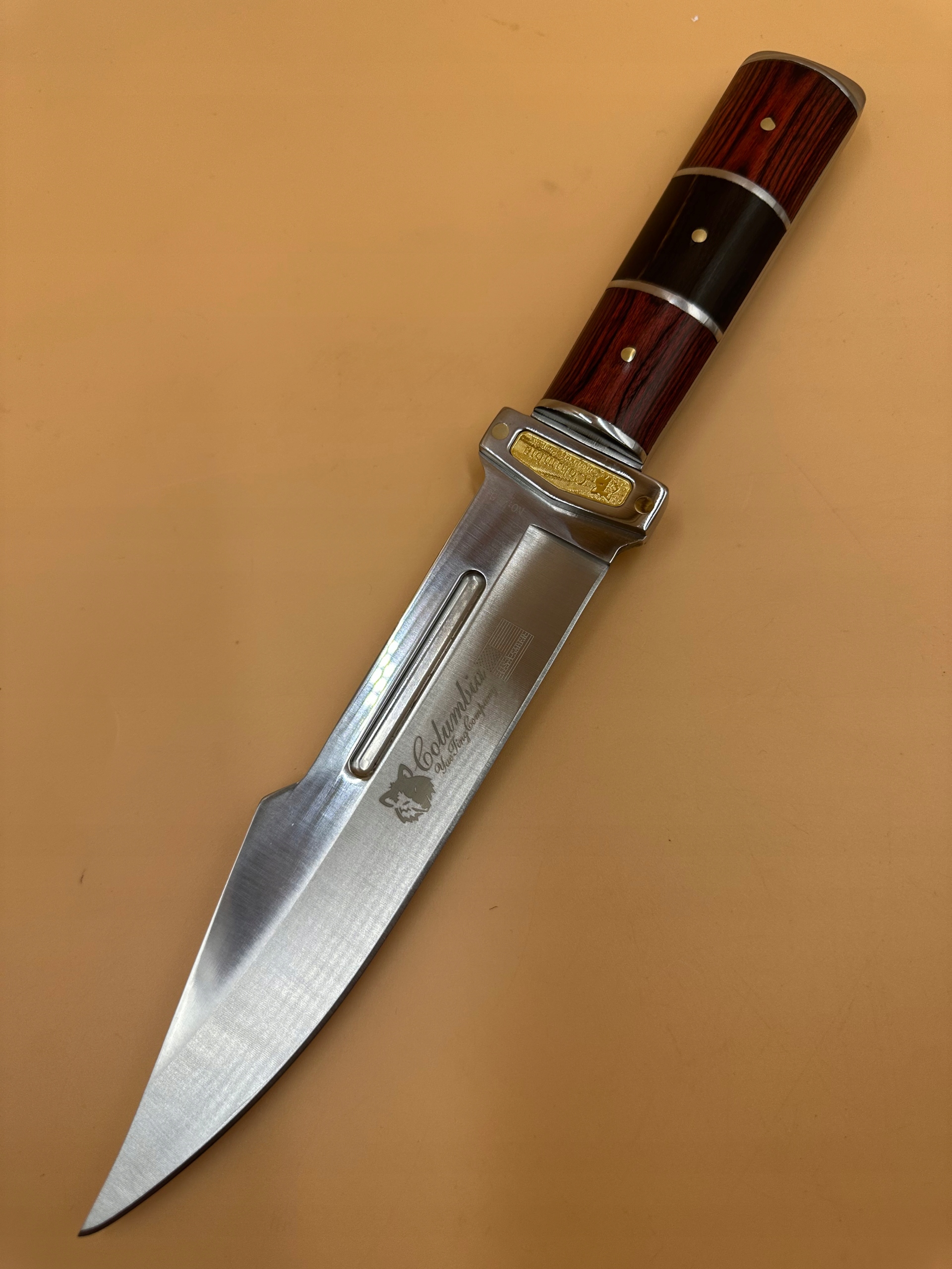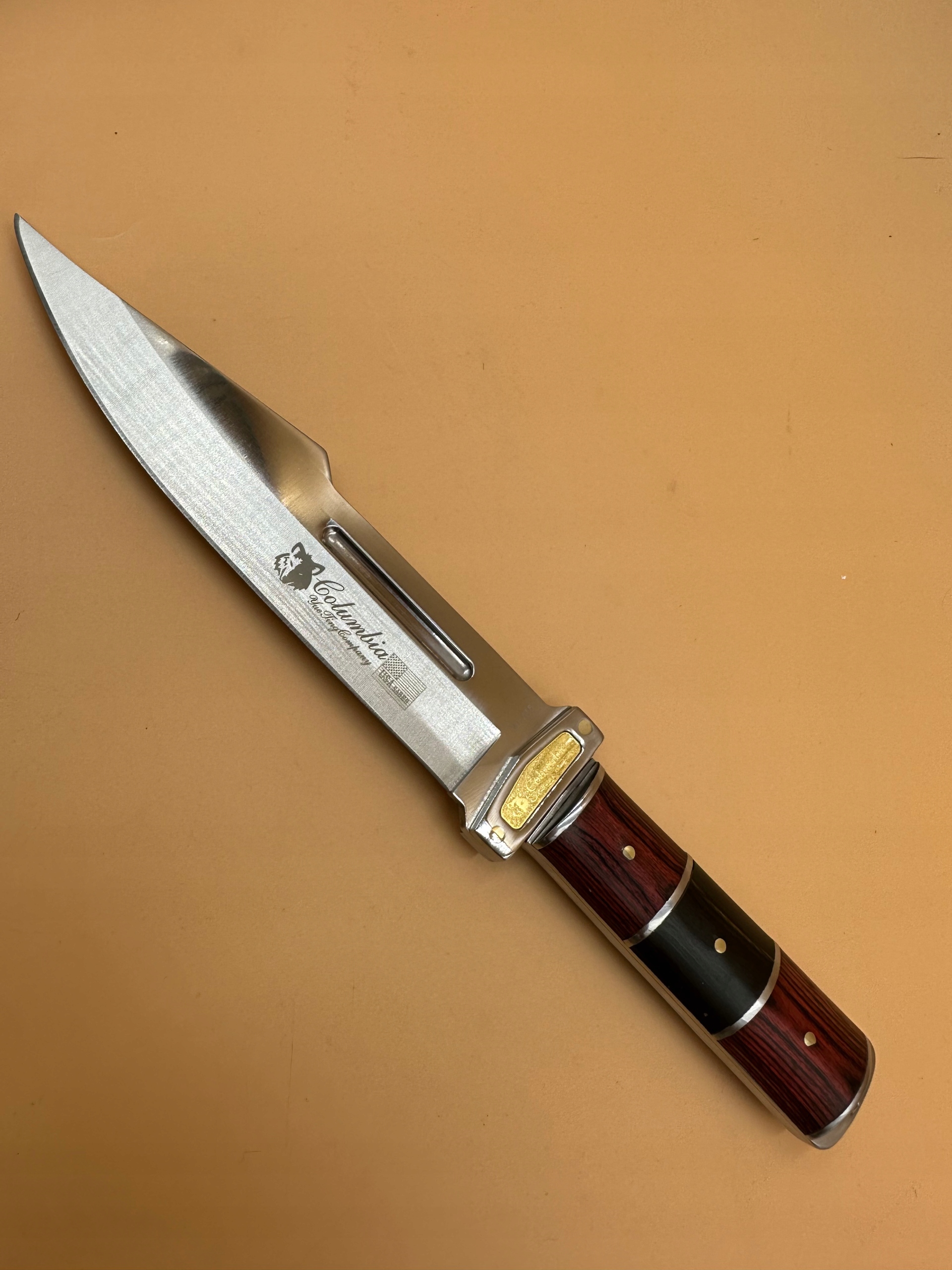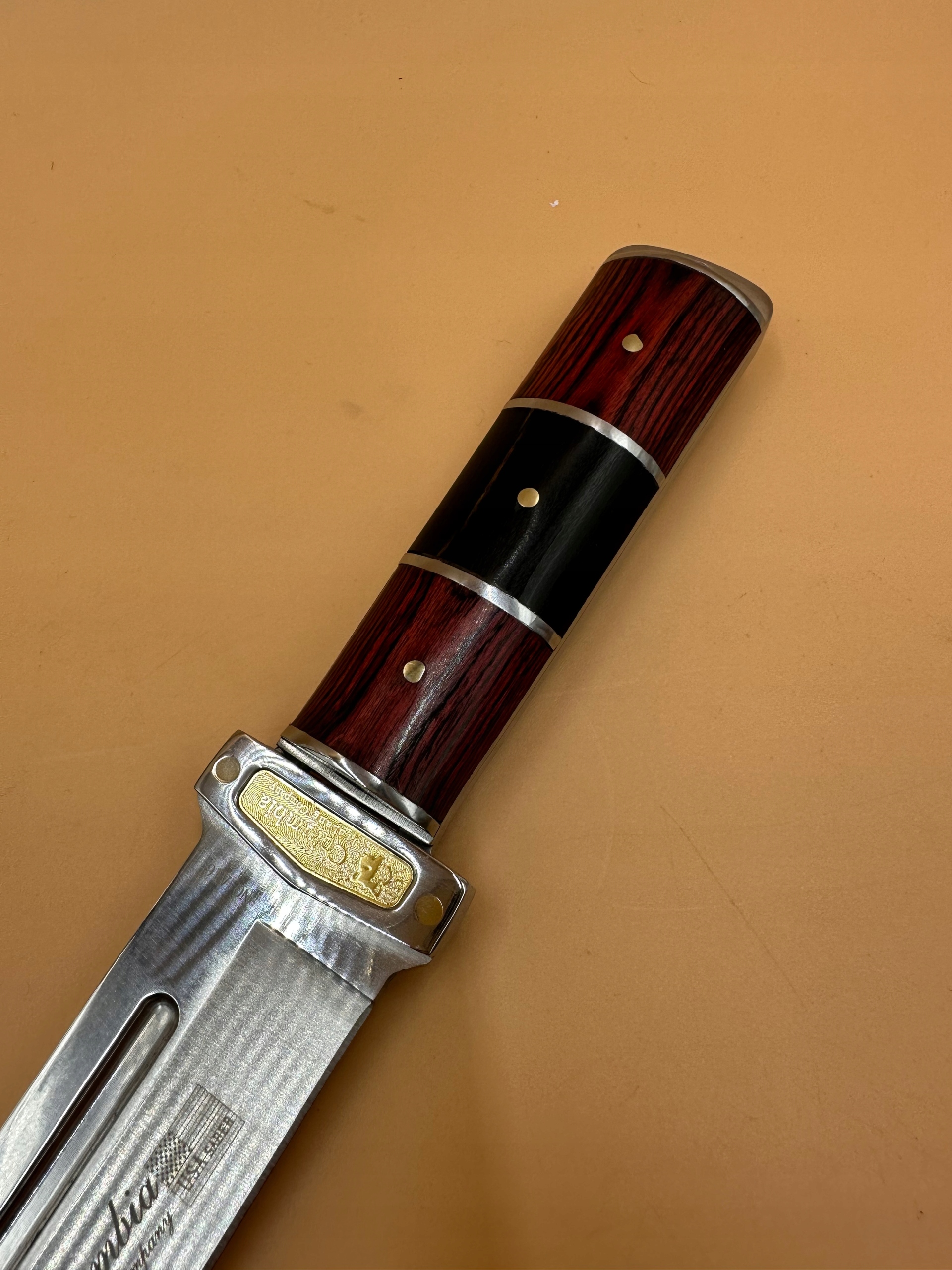 Рукоятка ножа унікально прикрашена складною ручною роботою - поєднанням двох видів екзотичне дерево та полірована нержавіюча сталь Гарда прикрашена латунним знаком, оздоблення латунними заклепками додає кілька балів престижу Ручка має отвір для ремінця на кінці. Виготовлення цього ножа вимагало багато роботи.