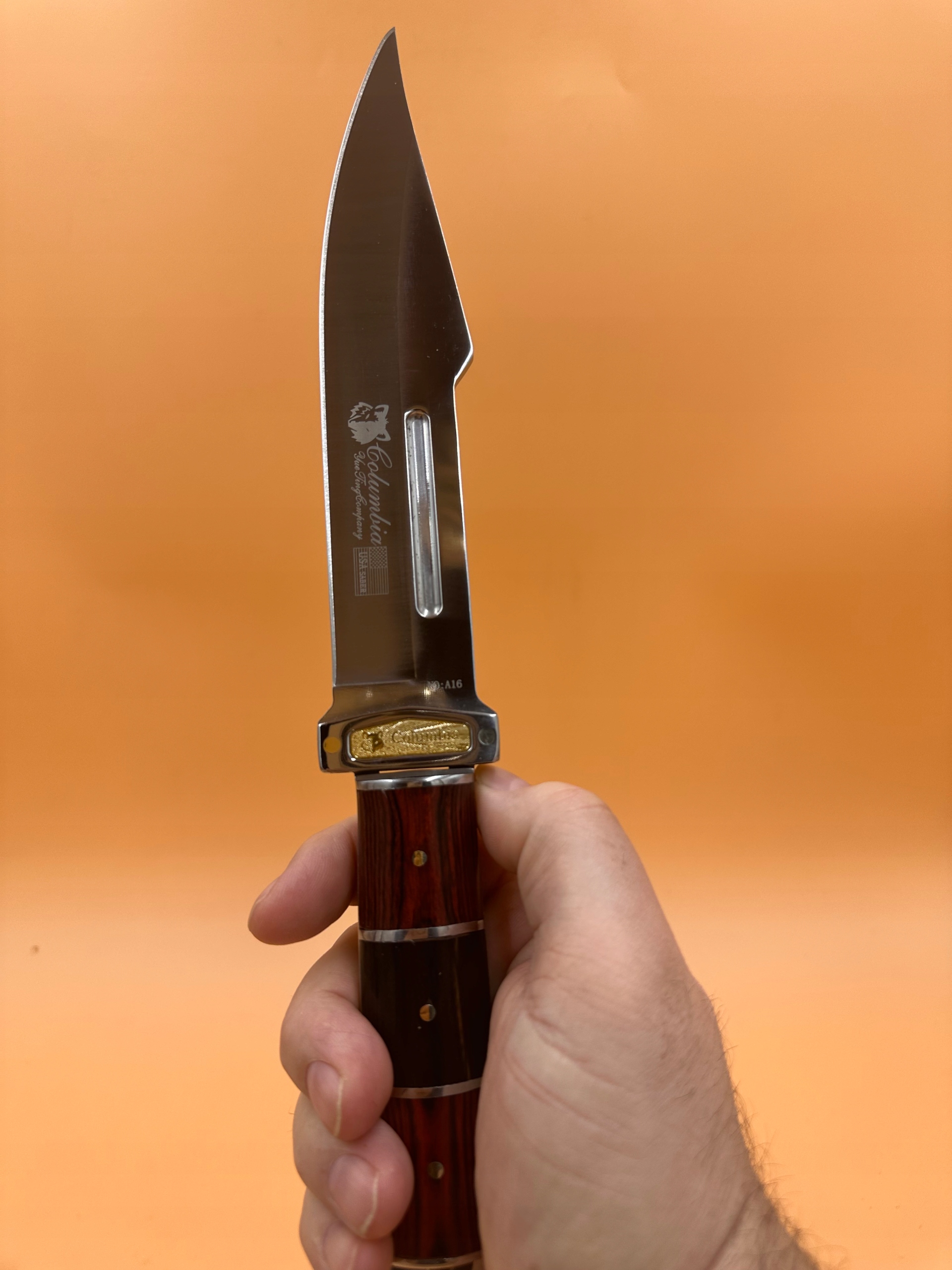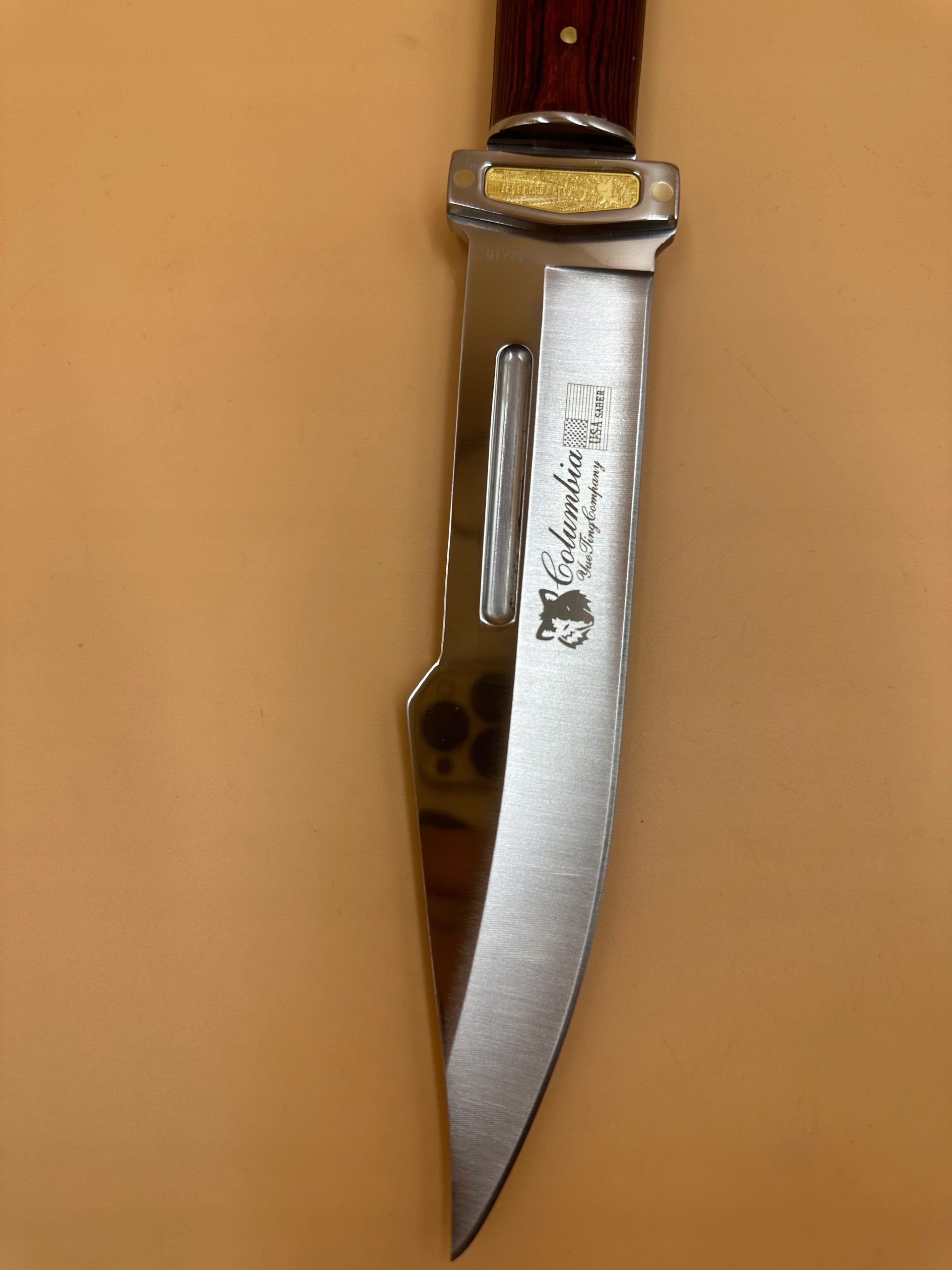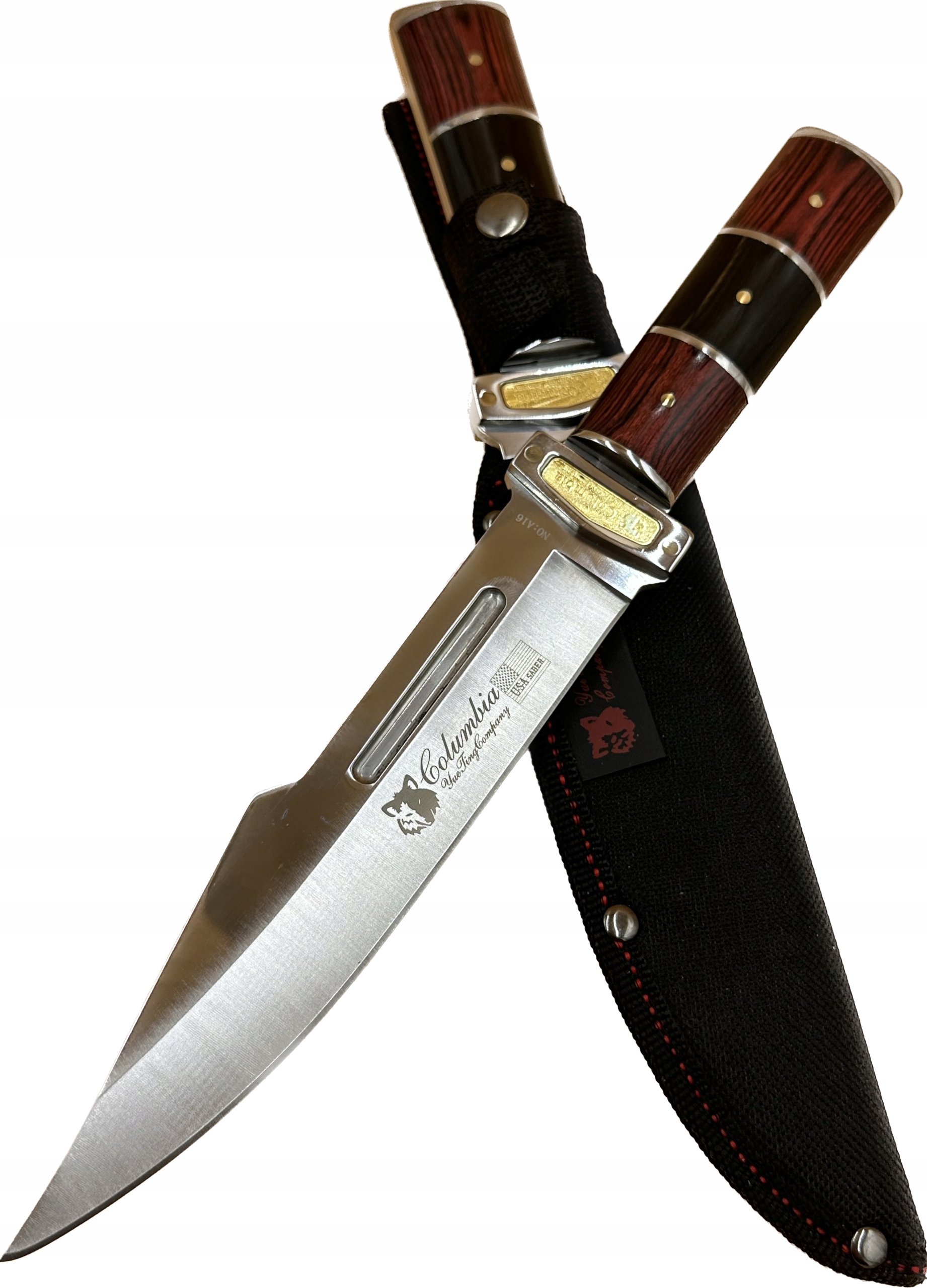 Рукоятка ножа унікально прикрашена складною ручною роботою - поєднанням двох видів екзотичне дерево та полірована нержавіюча сталь Гарда прикрашена латунним знаком, оздоблення латунними заклепками додає кілька балів престижу Ручка має отвір для ремінця на кінці. Виготовлення цього ножа вимагало багато роботи.