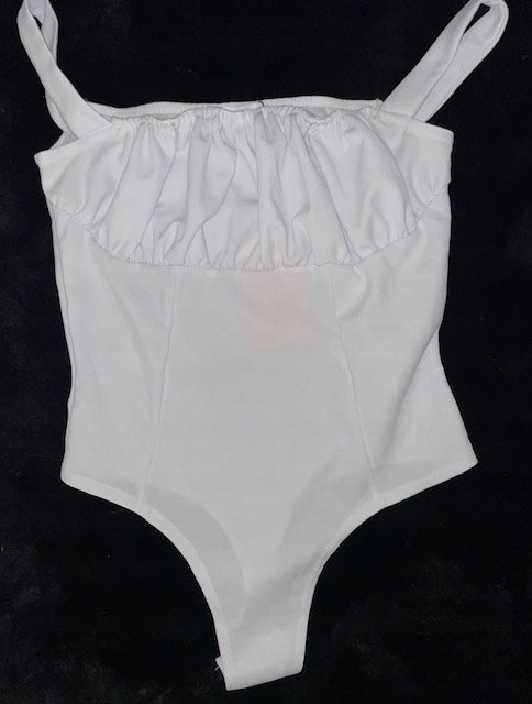 Боди з еластичного матеріалу. Розріз під грудьми і зібрані на грудях. Застібається на застібки в промежині.