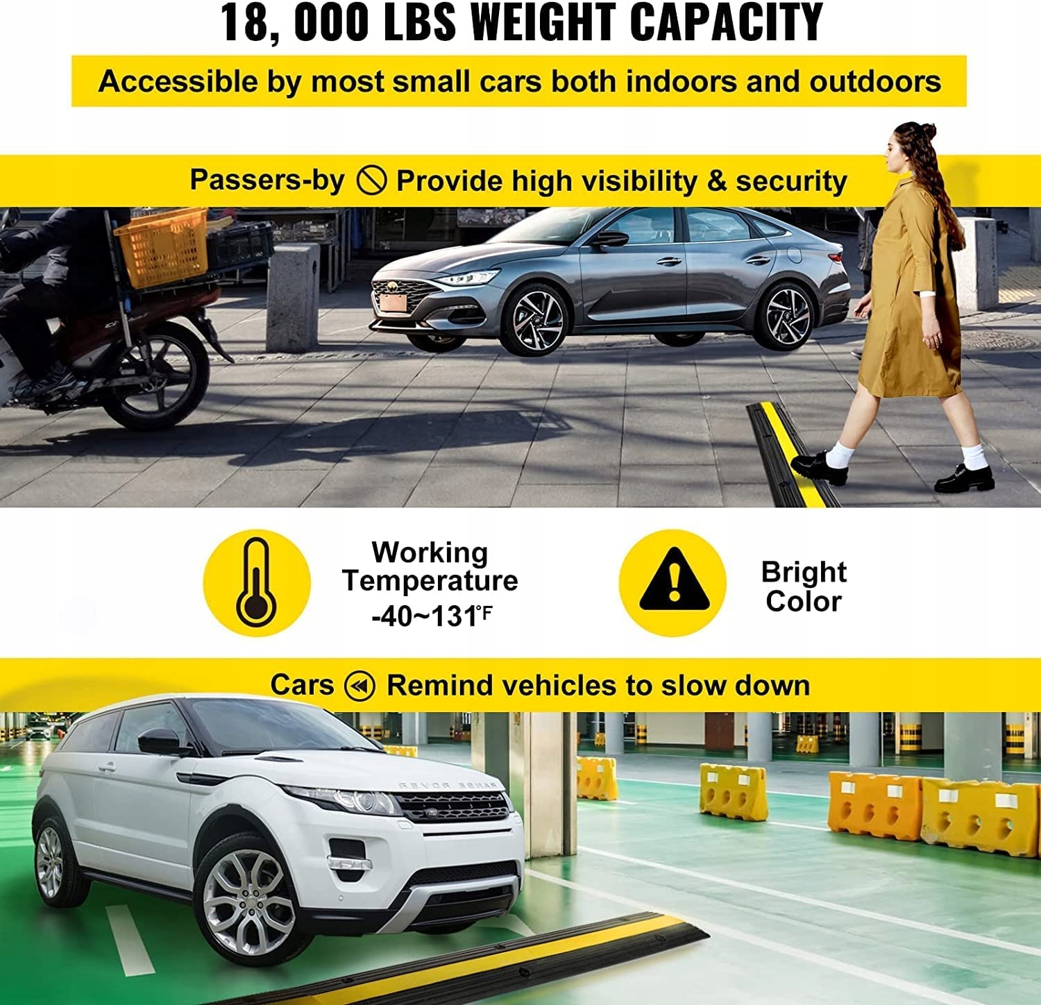 Захисна рампа кабелю захищає різні кабелі від пошкодження пішоходами та транспортними засобами. Крім того, лежачі поліцейські ідеально підходять для зниження швидкості легкових або вантажних автомобілів, щоб створити безпечне середовище для водіння на дорогах, стоянках тощо.