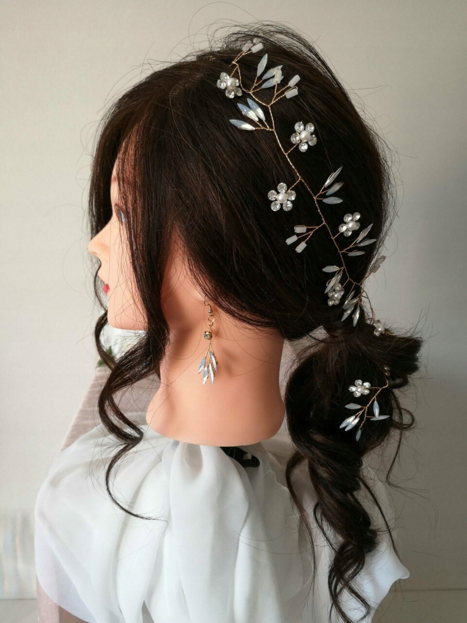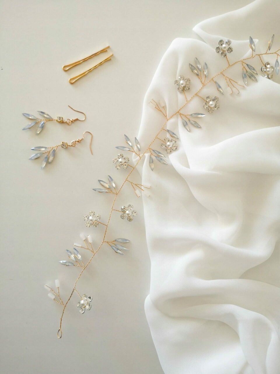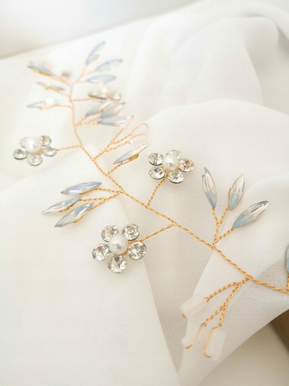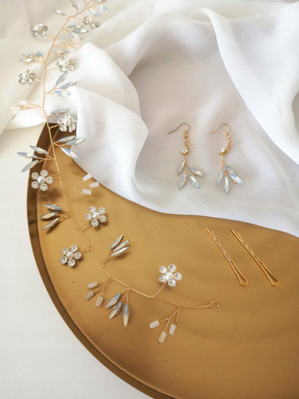 Набір весільних прикрас, що складається з смуги волосся та сережок. Набір прикрашений мотивом листя та квітів, а використовувані матеріали - стрази, перли та ніжні сині кристали. Ціле встановлено на ювелірному дроті золотистого кольору. Група еластична і може вільно вплетена у волосся, класично, як гілка або навколо весільного волосся. Набір включає два Zlotys, щоб приєднати його. Сережки чіткі, але ніжні та легкі.
