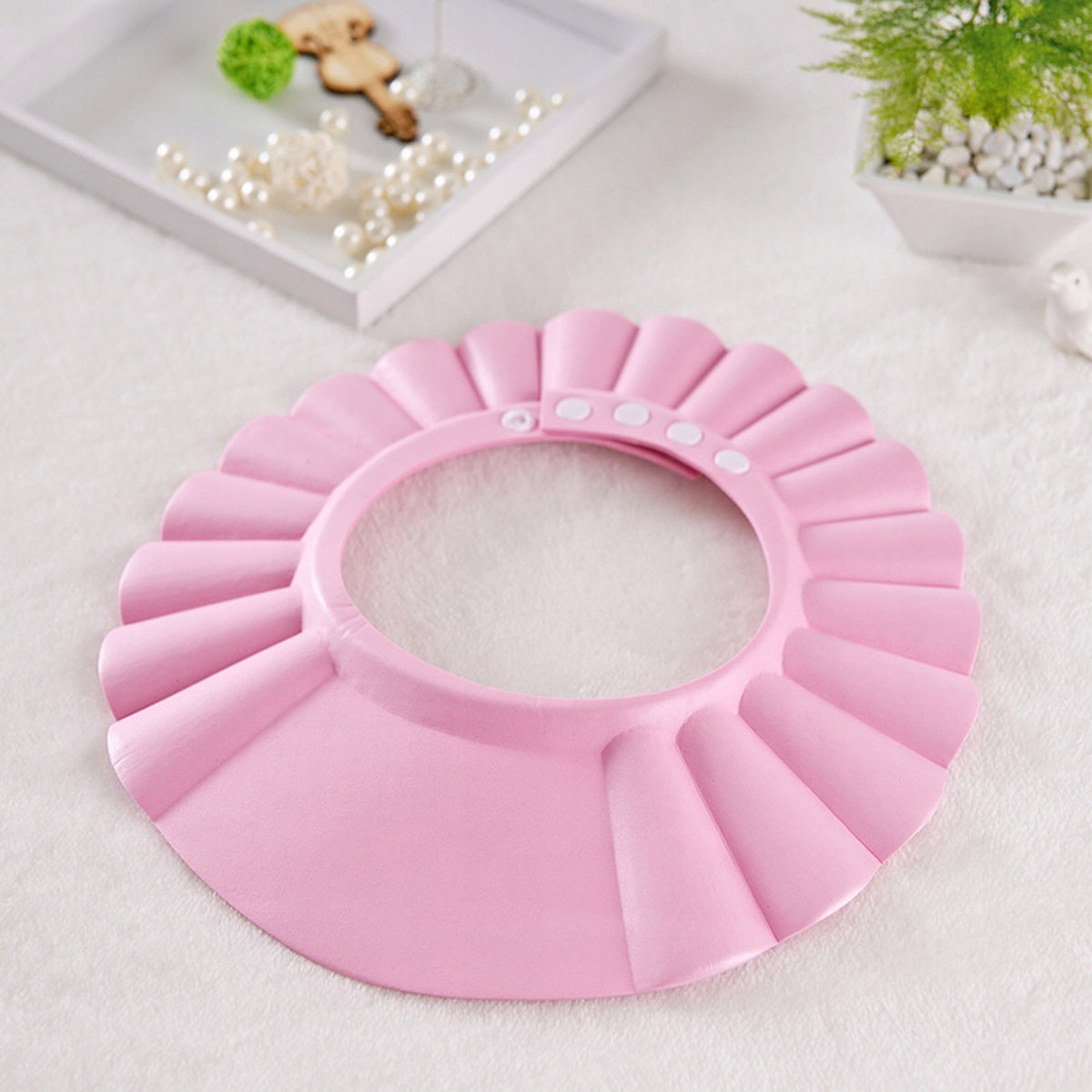 Незамінна для купання кожної маленької дитини. Ідеально прилягає до голови дитини завдяки регульованій застібці. Ефективно захищає очі вашої дитини від бризок. Виготовлений із міцного пластику, безпечного контакту зі шкірою.
